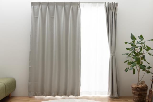 ヒダ山が2つの1.5倍ヒダ仕上げです。幅広いテイストのお部屋で使いやすい、スッキリとした見た目です。また、ドレープカーテンと共布のタッセルが付属しているので、光を取り込みたいときはカーテンをまとめておけます。