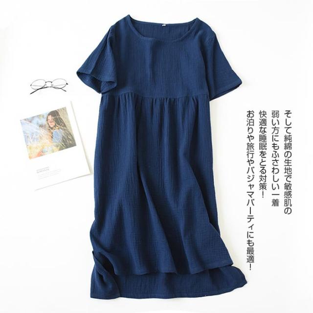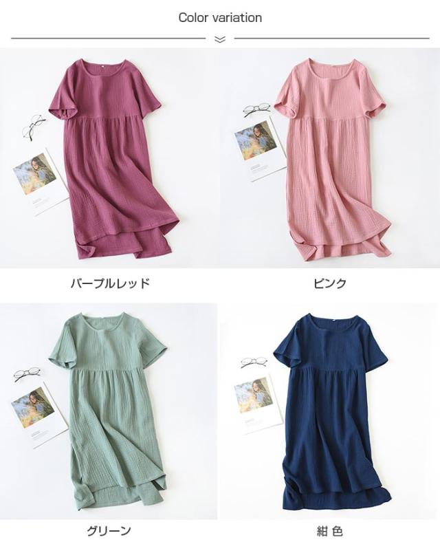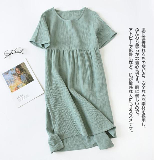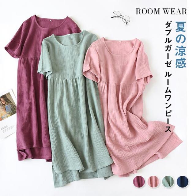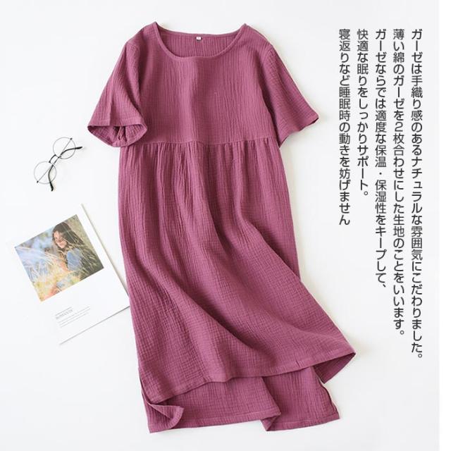 パジャマ ガーゼ ワンピース ダブルガーゼ ルームウエア 綿100% レディース ルームウェア 半袖 部屋着 肌に優しい コットン ミモレ丈 透けない 夏 ママ服 無地 送料無料