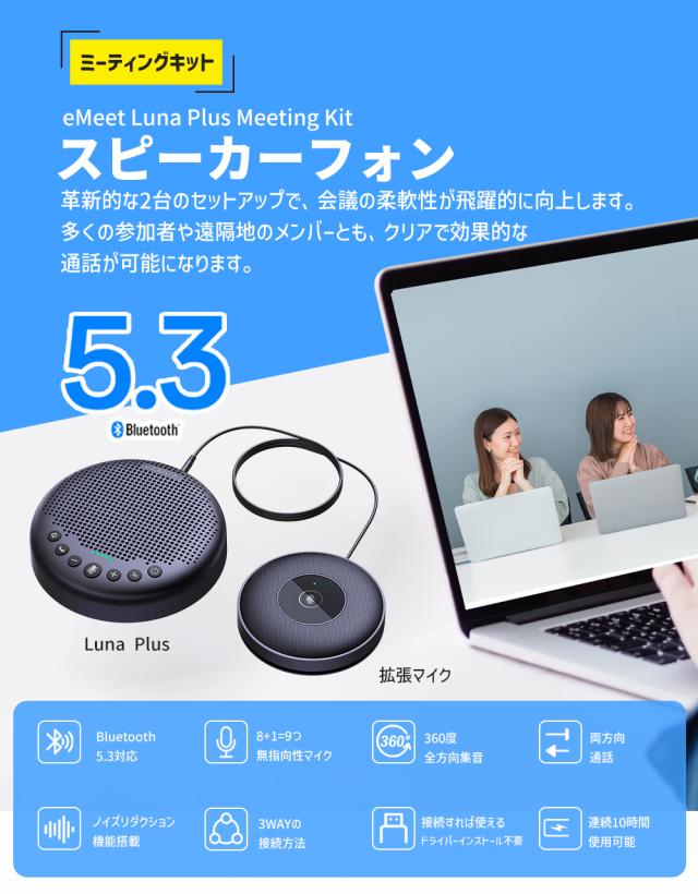 eMeet Luna Plus Kitは、会議室やオフィス、リモートワーク環境でのWeb会議・ハイブリッド会議を快適にする高性能オールインワン会議システムです。一体型設計により、カメラ・マイク・スピーカーをひとつに集約し、プロフェッショナルなオンラインミーティング環境を手軽に構築できます。