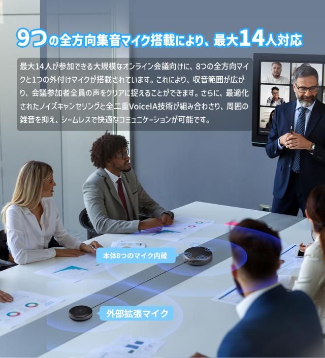 【8つの内蔵マイク+1拡張マイク&360°全方向の声を拾う】