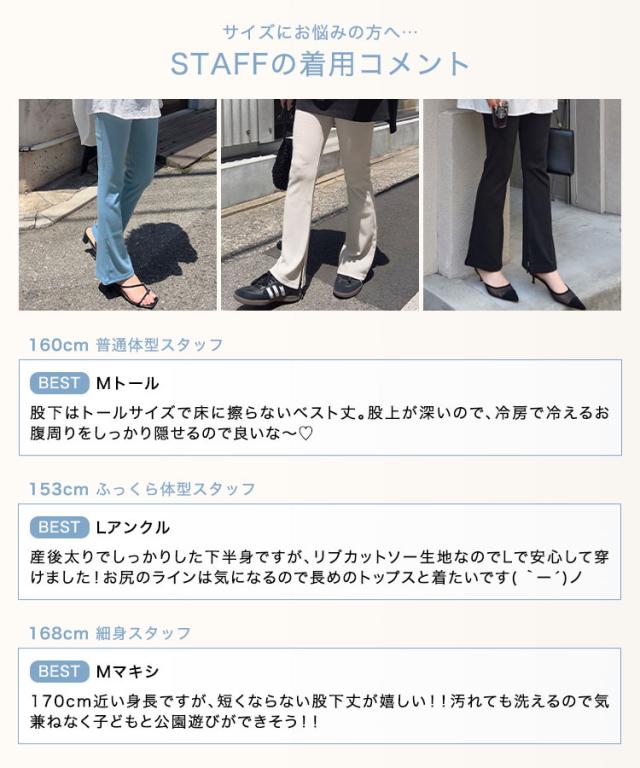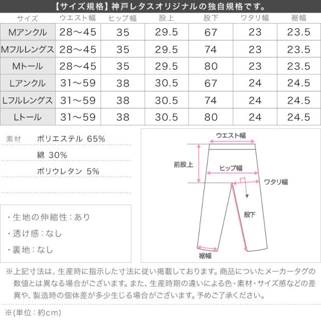 - 黒のLトールを購入しました。手頃なお値段だったので心配していましたが、とても縫製が丁寧で生地も肌触り良く股上も深めで動きやすいです。裾内側のスリットが長めで涼しくヒールが高いサンダルやもスニーカーでも合うデザインで購入して良かったと思っています。