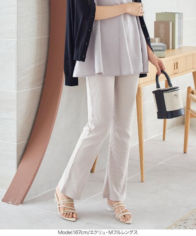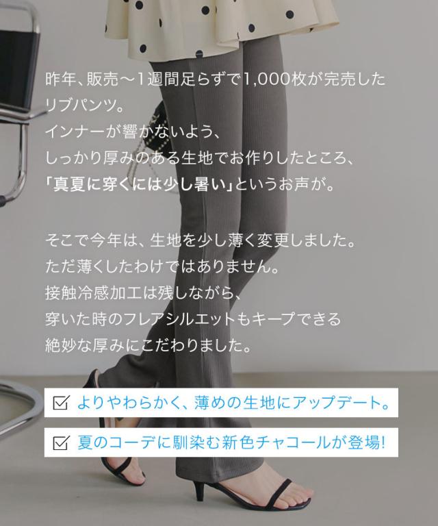 リラックススタイルには欠かせないカジュアルリブパンツ。ロングセラー商品の【M2807】に、待望の接触冷感Verが新登場。キシリトール加工でひんやり、冷たい穿き心地を実現しました。裾に向かって広がるフレアシルエットやリブの縦ラインがすっきりとキレイめな印象に仕立ててくれます。身長別、お好みの長さからお選びいただける3丈展開です◎【素材・サイズ感】ストレッチ性に優れたリブ素材&夏にうれしい接触冷感機能付きで、履き心地と機能性を兼ね備えた一着。内側に施したスリットが抜け感をもたらし、美脚見せを叶えます。ウエストは全ゴム仕様で脱ぎ履き楽ちんなリラクシーパンツなので、帰省や旅行の移動時、お子様の公園など活躍の場は様々です。※キャンセル/変更不可※お届けまでの日程について