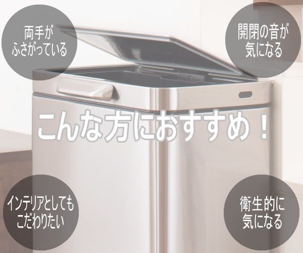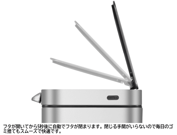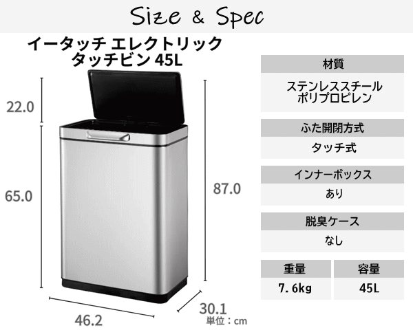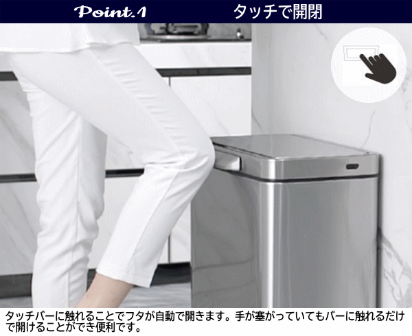 通常のタッチバー式ゴミ箱は開いた後に手でフタを閉じる必要がありました。タッチバーに触れることでフタが自動で開き5秒後に自動で閉まります。頻繁にゴミ箱の前を通るような場所への設置に最適です。バーを長押しすると開きぱなしになります。電源はUSB充電のリチウム電池で電池交換の手間がかかりません。1回の充電で3〜4ヶ月作動。本体、フタ、タッチバーすべてがステンレス製のため頑丈で汚れても簡単に拭き取ることができます。中箱付きのため密閉度が高く臭い漏れがしにくく汚れても丸洗いができるので衛生的です。■品名:イータッチエレクトリックタッチビン■品番EK9180RMT-45L■容量45L■本体サイズ46.2×30.1×65cm■梱包サイズ]52×34×70cm■重量7.6kg■主な材質: ステンレススチール、ポリプロピレン■カラー:シルバー■生産国:中国■保証:国内1年保証【大型商品のため同梱発送不可】