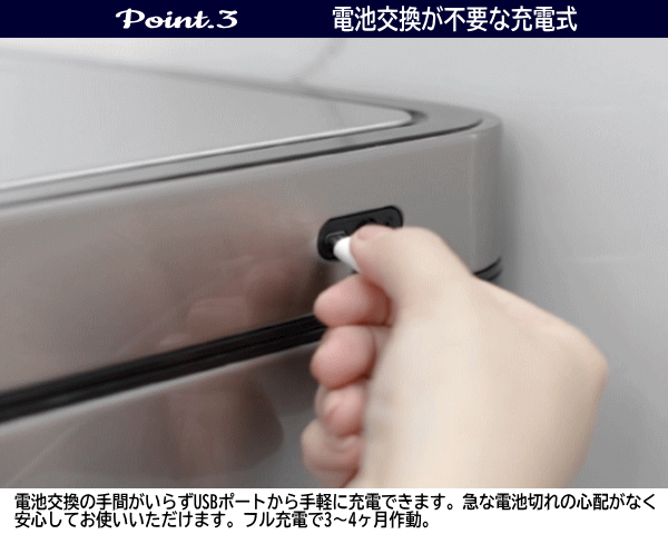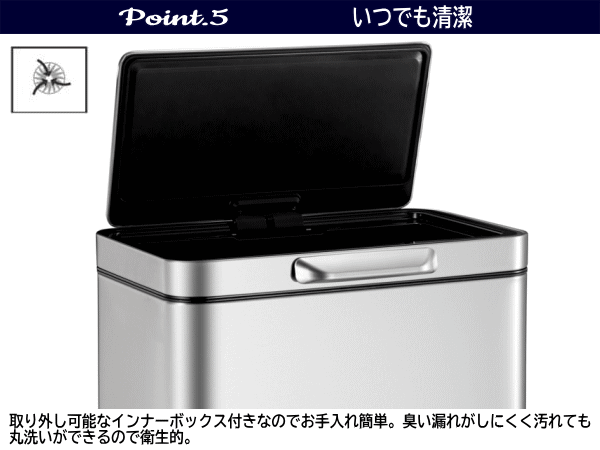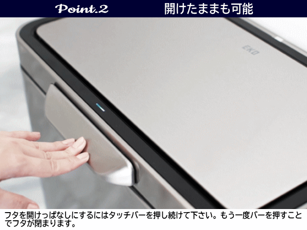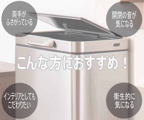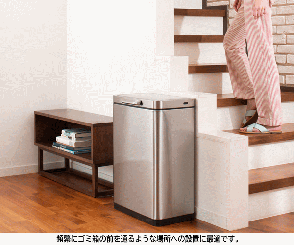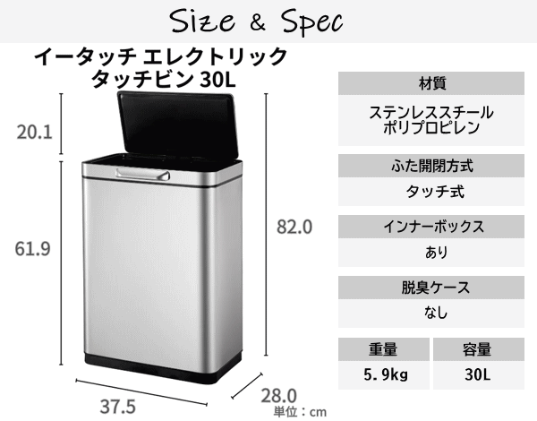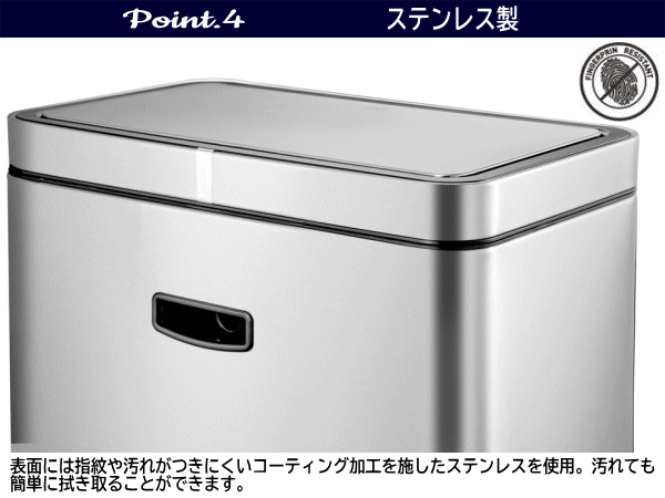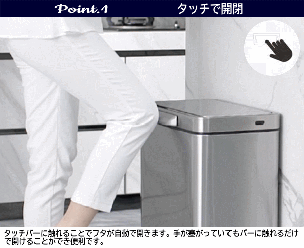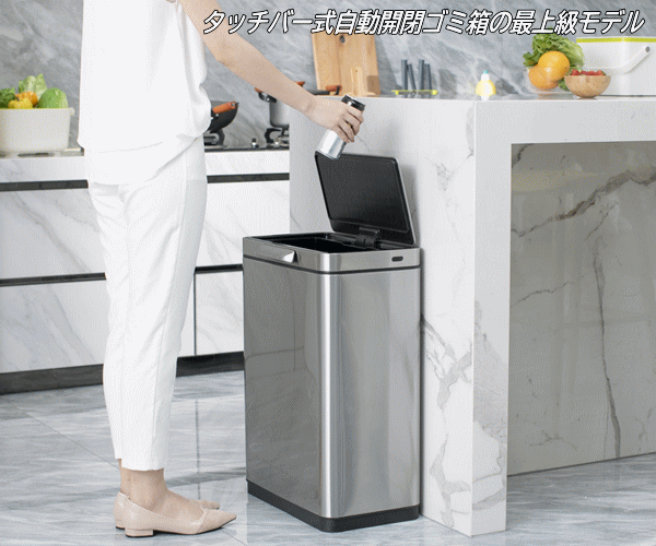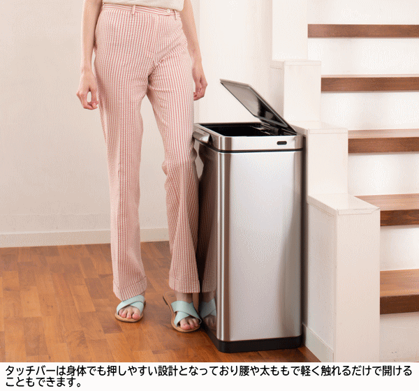 通常のタッチバー式ゴミ箱は開いた後に手でフタを閉じる必要がありました。タッチバーに触れることでフタが自動で開き5秒後に自動で閉まります。頻繁にゴミ箱の前を通るような場所への設置に最適です。バーを長押しすると開きぱなしになります。電源はUSB充電のリチウム電池で電池交換の手間がかかりません。1回の充電で3〜4ヶ月作動。本体、フタ、タッチバーすべてがステンレス製のため頑丈で汚れても簡単に拭き取ることができます。中箱付きのため密閉度が高く臭い漏れがしにくく汚れても丸洗いができるので衛生的です。■品名:イータッチエレクトリックタッチビン■品番EK9180RMT-30L■容量30L■本体サイズ37.5×28×61.9cm■梱包サイズ40×32×65cm■重量5.9kg■主な材質: ステンレススチール、ポリプロピレン■カラー:シルバー■生産国:中国■保証:国内1年保証【大型商品のため同梱発送不可】
