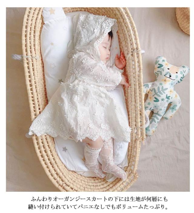 | レース花柄のフリルが胸元に施されていてキュート。 ふんだんに使われたレースの長いスカートがとてもゴージャスです。 清潔感のあるサテンのリボンがあしらわれ。 ふんわりオーガンジースカートの下には生地が何層にも縫い付けられていてパニエなしでもボリュームたっぷり。 お揃いの帽子はクラシカルなヨーロッパ調。首の下でひもを結ぶ形です。 裏地の部分はコットンで、赤ちゃんのお肌にもやさしい上質素材です。 | |