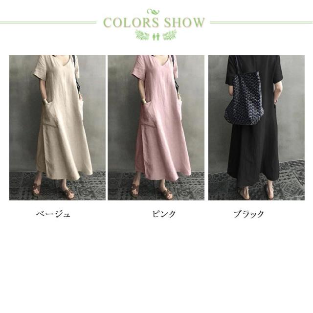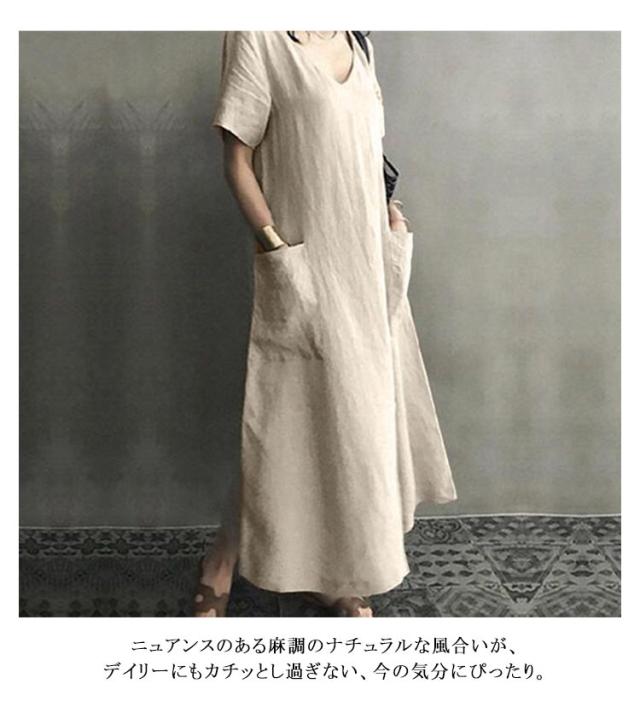 リネンVネックワンピース 綿麻 リネンワンピース 半袖 レディース ロングワンピース 体型カバー リネンワンピ 麻ワンピ コットンリネン ゆったり 大きいサイズ Aライン ポケット付き おしゃれ 大人 可愛い 通勤 40代 30代 送料無料