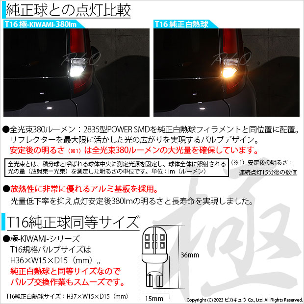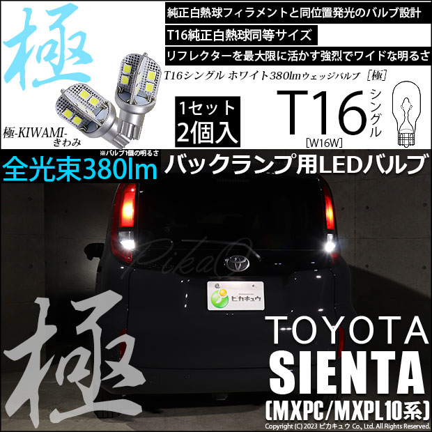 ピカキュウ,LED専門店,LEDバルブ,国産DC12V車,LED,SMD,T16シングル,W16W,バックランプ,ホワイト,全光束380lm,ハイブリッド車対応,極,KIWAMI,きわみ,トヨタ ,TOYOTA,シエンタ,sienta,MXP系,MXPL15G,MXPL10G,MXPX10G