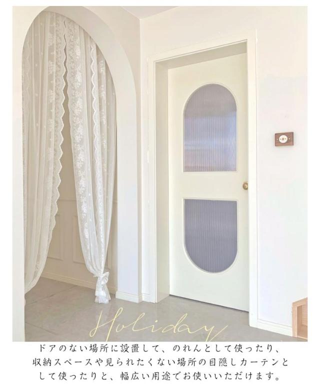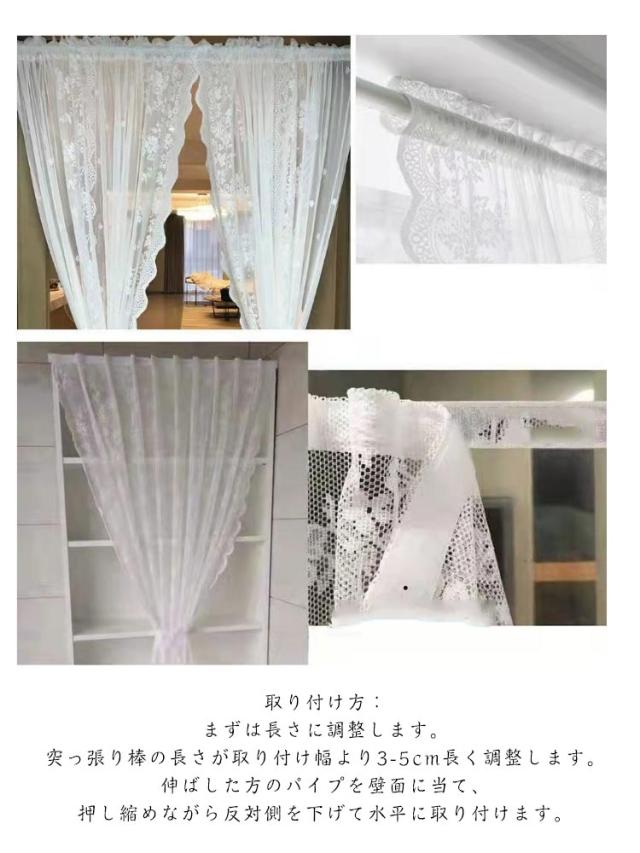 | 突っ張り棒付き!レース生地の間仕切りカーテン。 つっぱり棒だけで簡単に設置できる間仕切りカーテンです。 透け感のあるレースが光と風を取り込みながら、空間をエレガントに装います。 北欧風の花柄が空間をさりげなくオシャレにコーディネイトしてくれます。 ドアのない場所に設置して、のれんとして使ったり、収納スペースや見られたくない場所の目隠しカーテンとして使ったりと、幅広い用途でお使いいただけます。 通気性のあるカーテンで、春夏秋冬、季節を問わずお使いいただけます。 お部屋、キッチンの出入り口に、洗面スペースの間仕切りに。 取り付け方: まずは長さに調整します。 突っ張り棒の長さが取り付け幅より3-5cm長く調整します。 伸ばした方のパイプを壁面に当て、押し縮めながら反対側を下げて水平に取り付けます。 | |