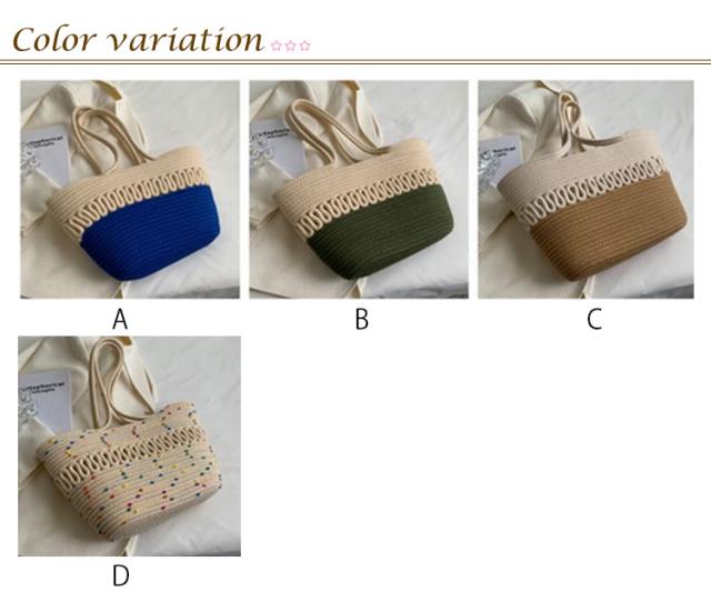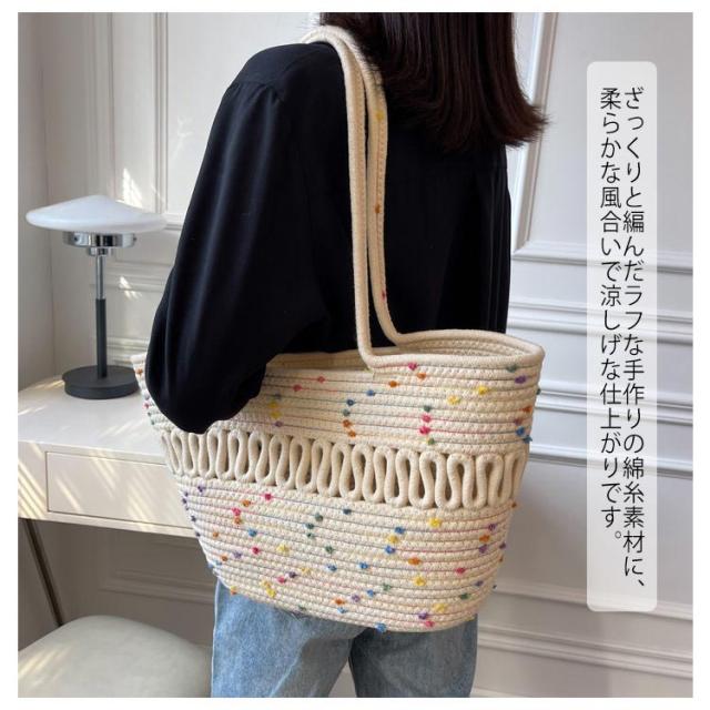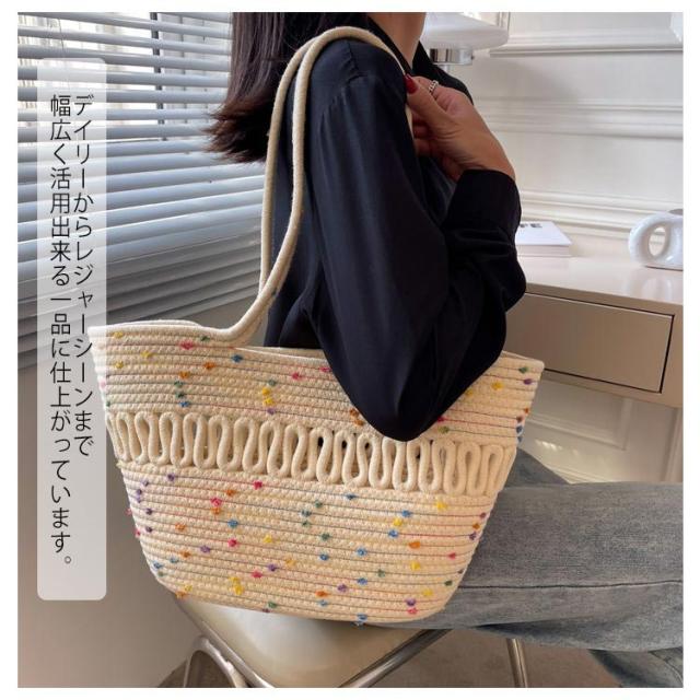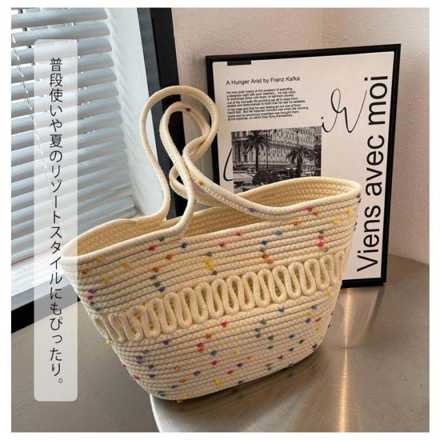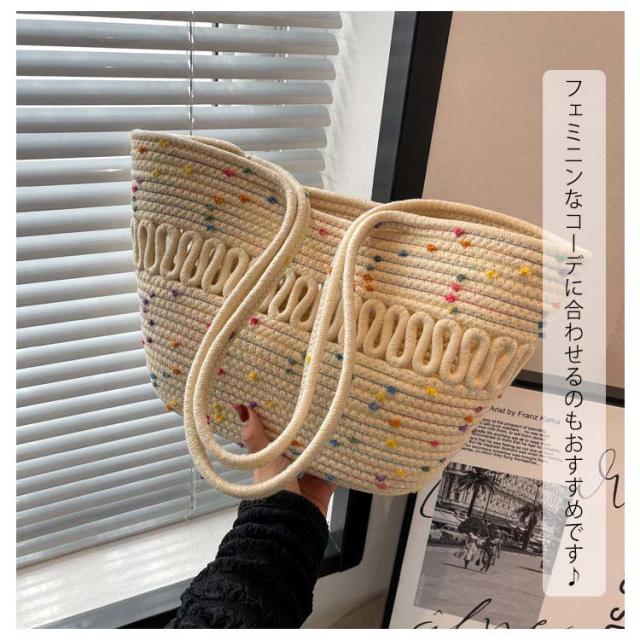 | 見た目以上の大容量、ナチュラル夏バッグ 毎日のスタイリングに合わせやすい、カジュアルでシンプルなデザイン。 長財布、化粧ポーチ、手帳、スマホ、水筒、傘など収納できて、見た目以上の大容量! ざっくりと編んだラフな手作りの綿糸素材に、柔らかな風合いで涼しげな仕上がりです。 デイリーからレジャーシーンまで幅広く活用出来る一品に仕上がっています。 フェミニンなコーデに合わせるのもおすすめです♪ 普段使いや夏のリゾートスタイルにもぴったり。 | |