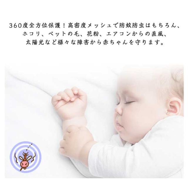 | 穴あけ不要天蓋蚊帳♪様々なベビーベッドに適用。 床に自立スタンド型とベビーベッドにクリップするタイプ展開、壁を痛めることなくて済むのが嬉しいポイント。賃貸やマンションOK! 360度全方位保護!高密度メッシュで防蚊防虫はもちろん、ホコリ、ペットの毛、花粉、エアコンからの直風、太陽光など様々な障害から赤ちゃんを守ります。 細かいネットが蚊の侵入をブロック!ネットは通気性が良く、中に風を取り込むので熱がこもりません。 | |