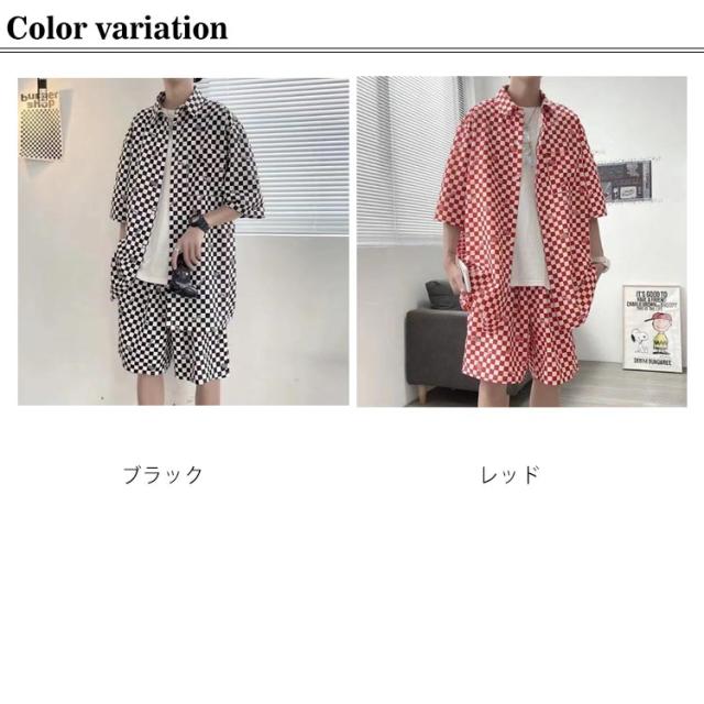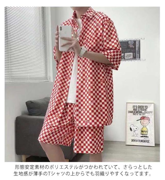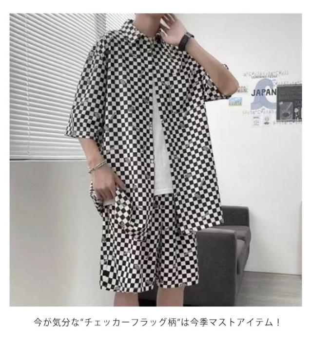 柄シャツ セットアップ メンズ 半袖 シャツ ショートパンツ ハーフパンツ 2点セット チェッカーフラッグ柄 ゆったり 大きいサイズ 夏 海 川 リゾート 総柄シャツ アロハシャツ セットアップ カジュアル おしゃれ ストリート 夏休み 【送料無料】