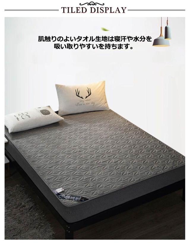 | 【防水シーツ 5色×7サイズ 選べる!】 【高い防水性】 【吸汗速乾性】 【丸洗いok】 【安心の品質】 コーティング加工面の防水性が高く、マットレスに水分は到達しません。 肌触りのよいタオル生地は寝汗や水分を吸い取りやすいを持ちます。 汗をかいても爽やかで、サラッと快適に眠れます。 お手入れ方法が簡単。洗濯機で丸洗いできることで清潔・衛生的に保ちます。 肌触りも良く、敏感肌持ちの方にも安心して使える防水シーツです。 | |