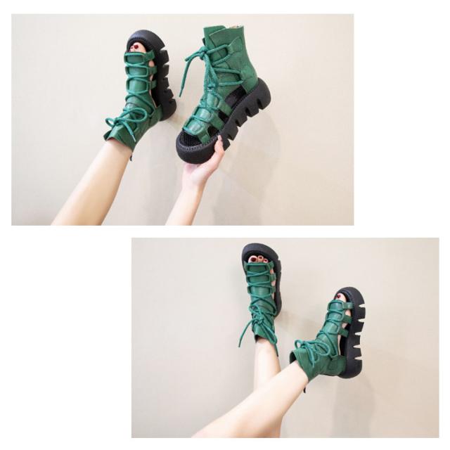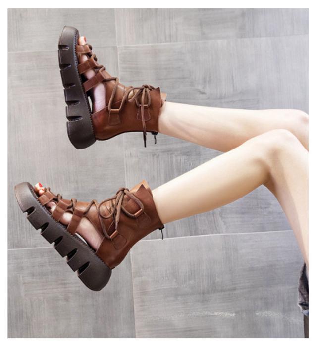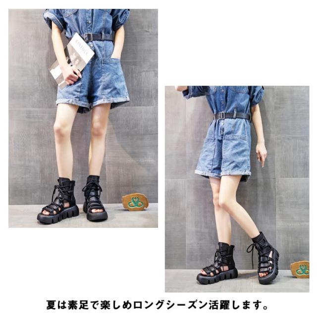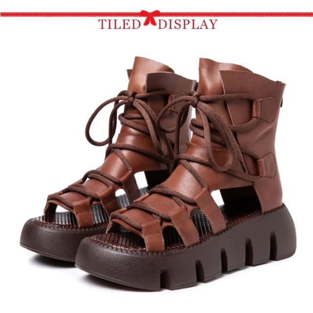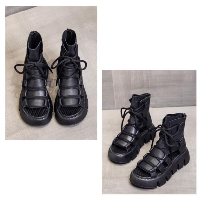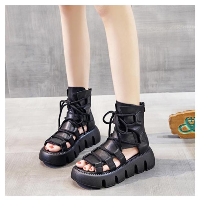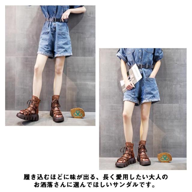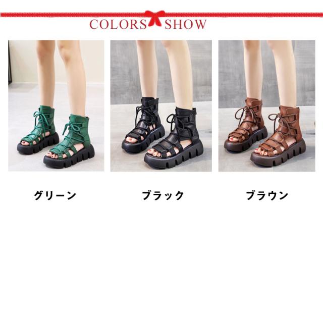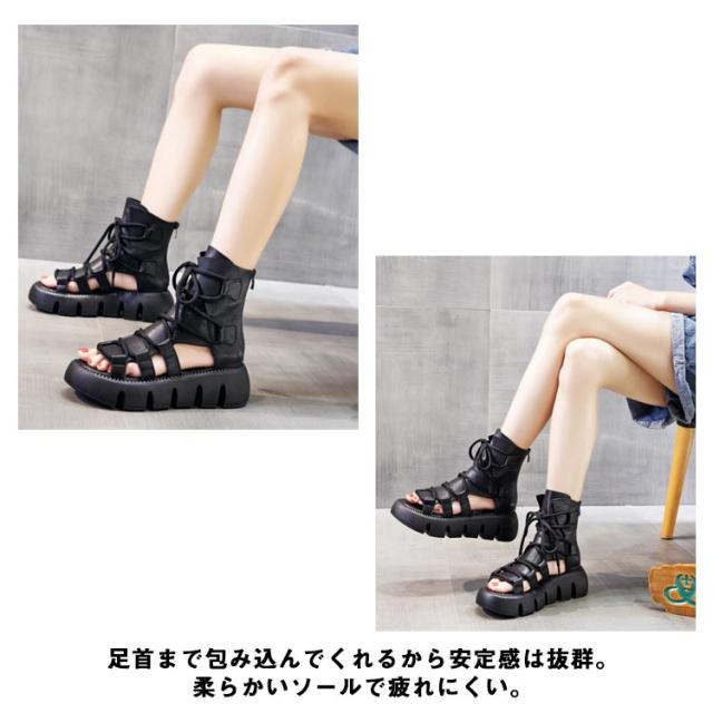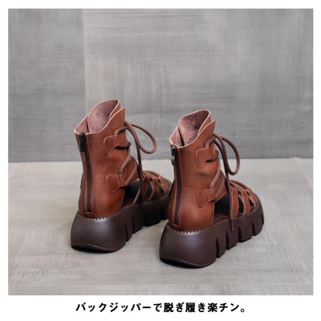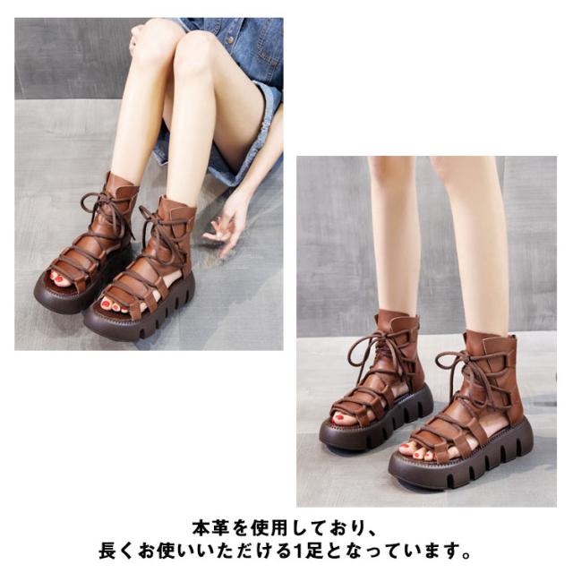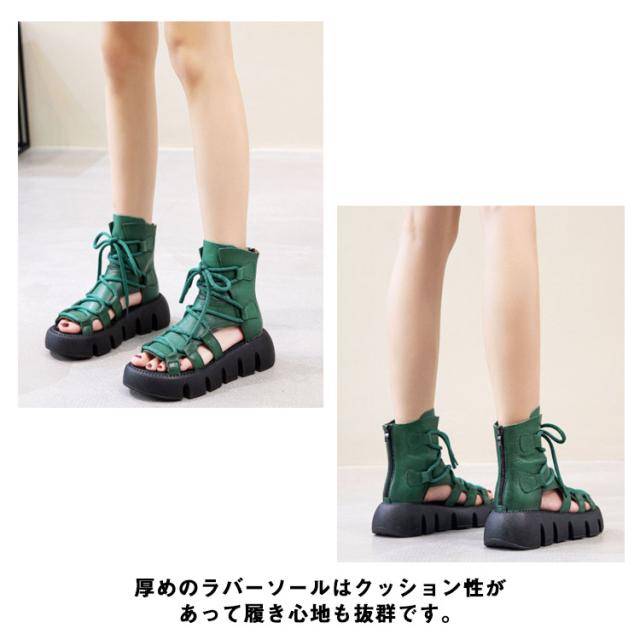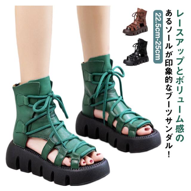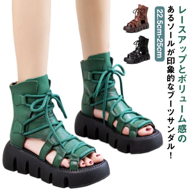 ブーツサンダル レディース 厚底 サンダル オープントゥ レースアップ バックファスナー レザーサンダル 本革 牛革 疲れにくい 歩きやすい サマーブーツ ハイカット グラディエーター サンダル カジュアル ブラック ブラウン グリーン