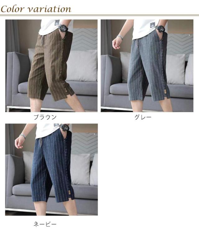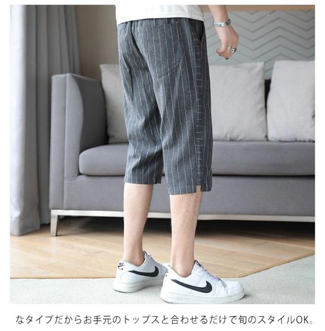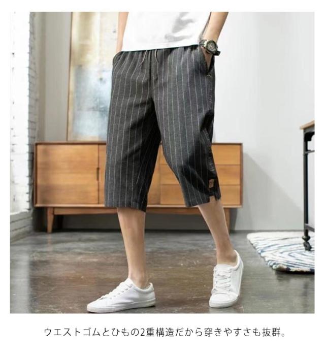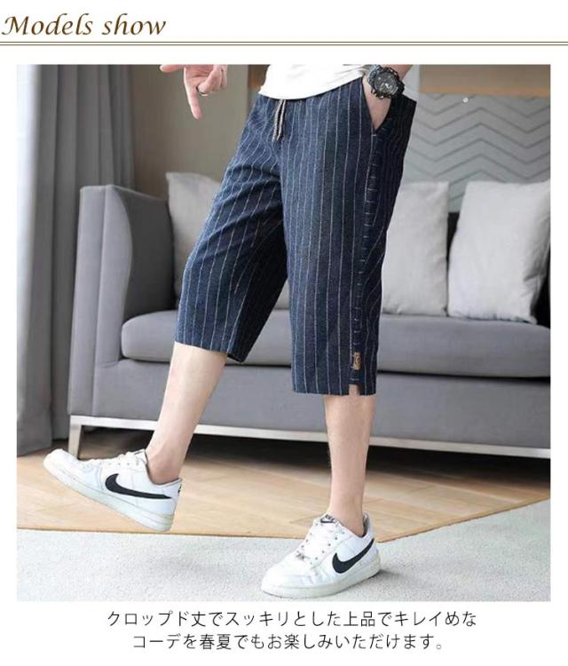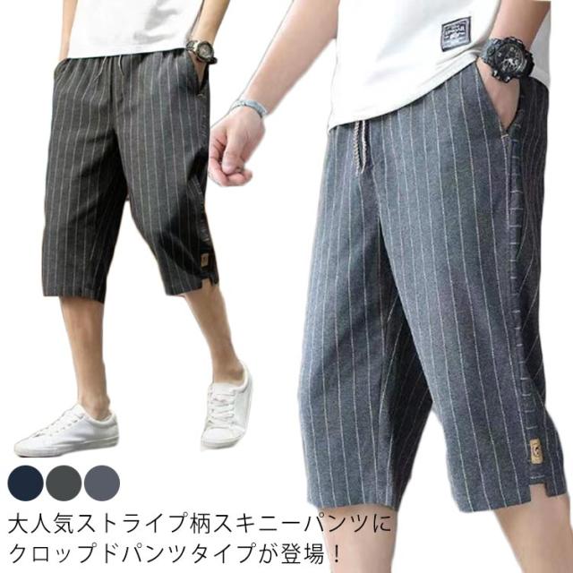 クロップドパンツ メンズ スキニー 7分丈 スキニーパンツ 送料無料 ストライプ 総柄 クロップド カジュアルパンツ リネンパンツ 半端丈 スリム 涼しい 夏 綿麻 テーパード ウエストゴム