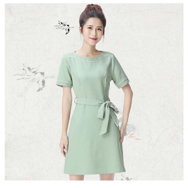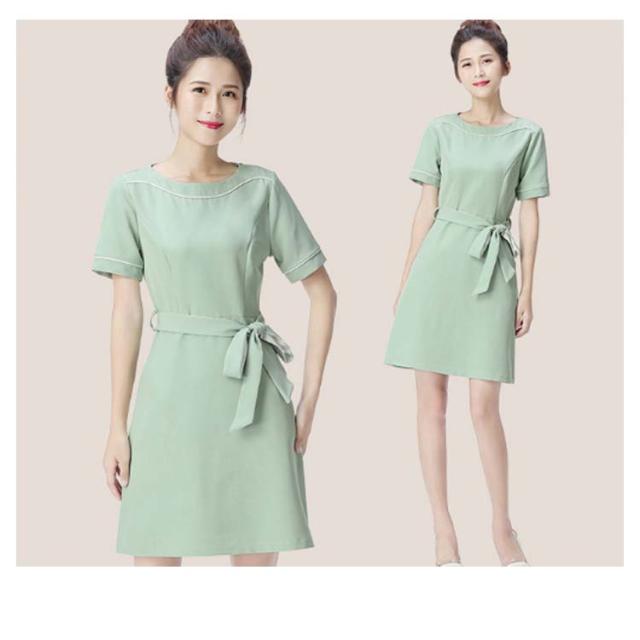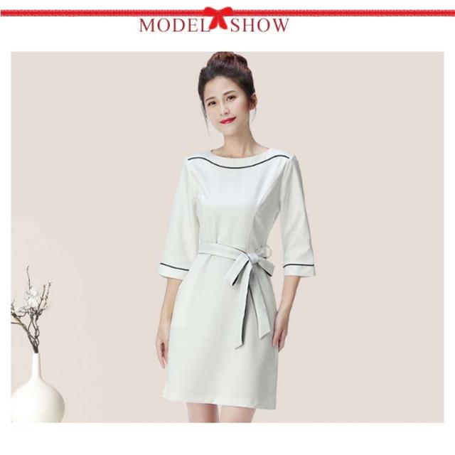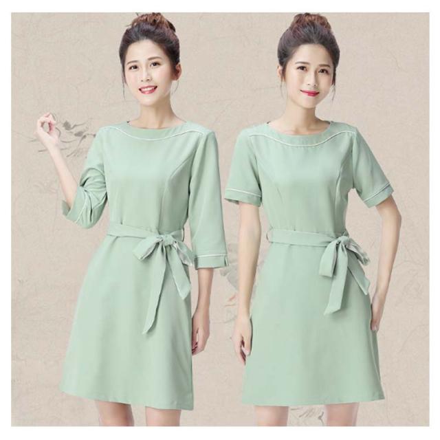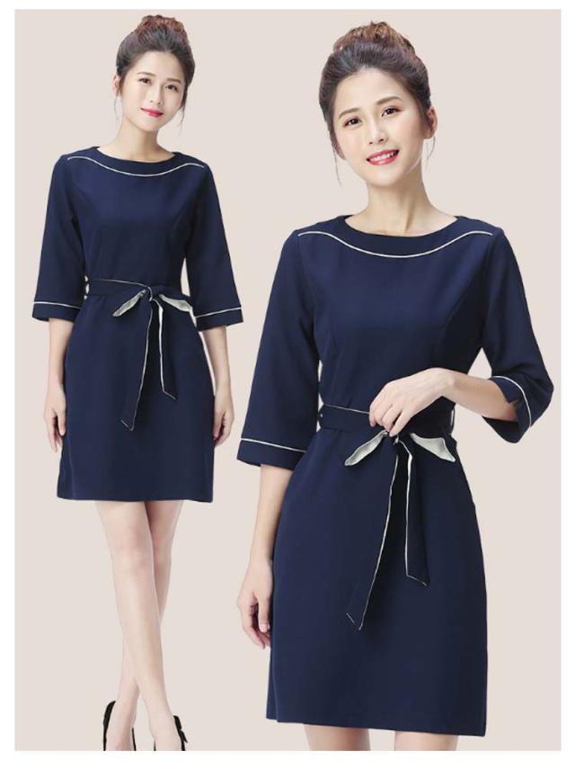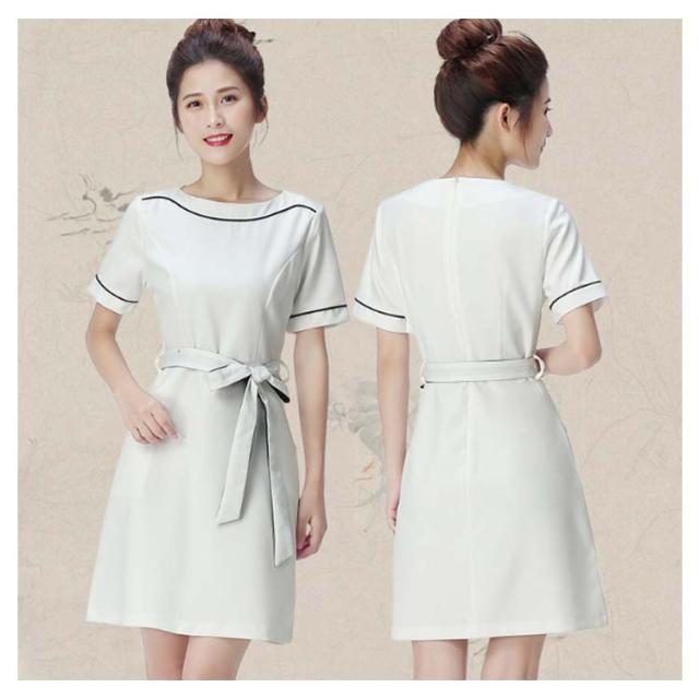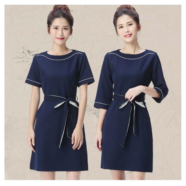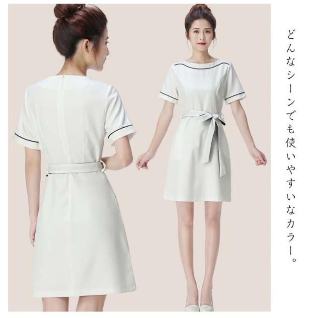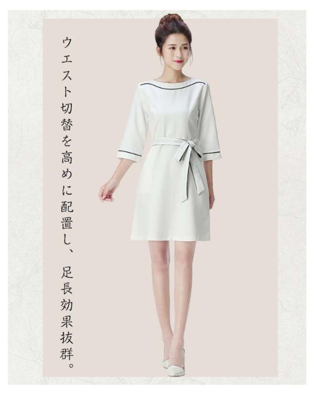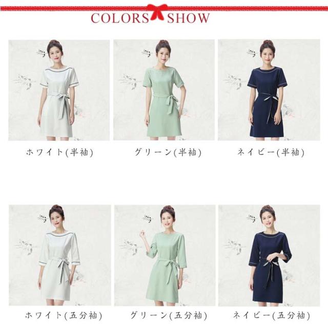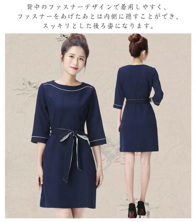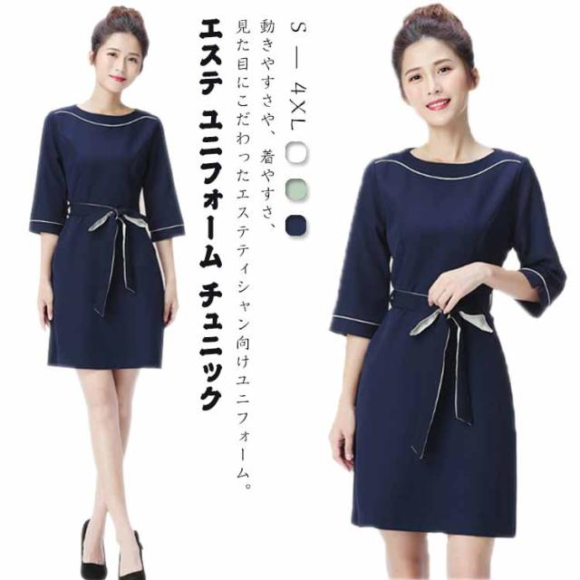 エステ ユニフォーム チュニック 制服 エステ ワンピース レディース ワンピ 半袖 五分袖 配色 パイピング サービス 作業着 サロン 美容師 事務 受付 歯科 美容 クリニック 作業服 女性用 おしゃれ ネイビー 紺 ホワイト リボン付き 【送料無料】