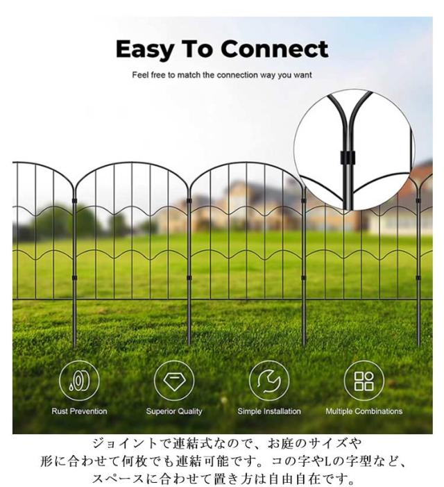 | 華やかで高級感のあるアイアンフェンス10枚セットです。【35*60cm】×10枚 見通しのいいアイアンフェンスは、お庭をすっきり広く見せますし、よりおしゃれに飾れます。 【耐久性に優れる】頑丈なアイアン製品、木製のものより経年劣化が少なです。防錆処理を施しているので、錆に強く、長くお使いいただけます。 【自由にアレンジ】ジョイントで連結式なので、お庭のサイズや形に合わせて何枚でも連結可能です。コの字やLの字型など、スペースに合わせて置き方は自由自在です。 【設置簡単】フェンスは組立て不要、地面に差し込むだけなので、設置が簡単です。きちんと地面に差し込めば、安定性もばっちりです。 【様々な用途】花壇やお庭、家庭菜園などのフェンス、仕切りとして使ったり、中小型犬のドックランフェンスとして使ったり、つる性の植物を絡ませてトレリスとしてもお使いいただけます。 | |