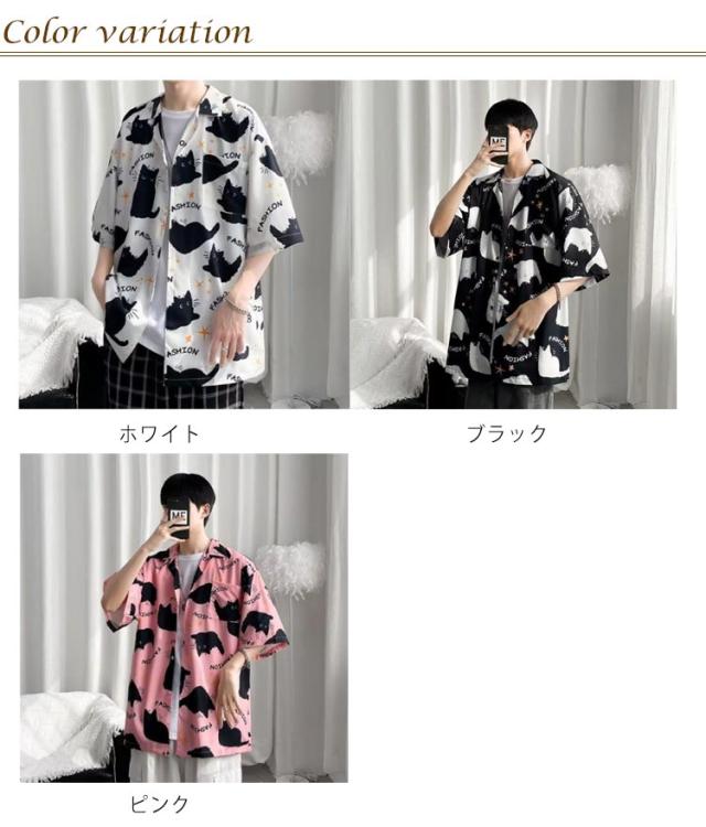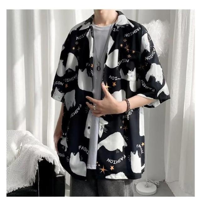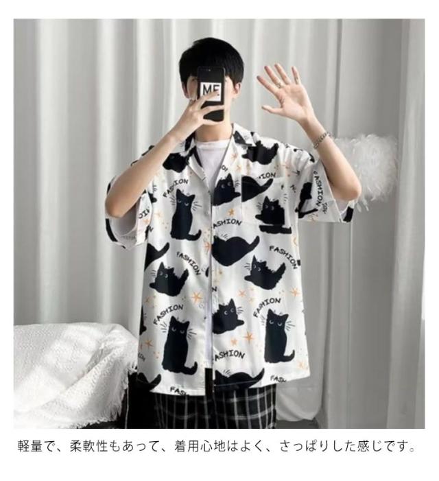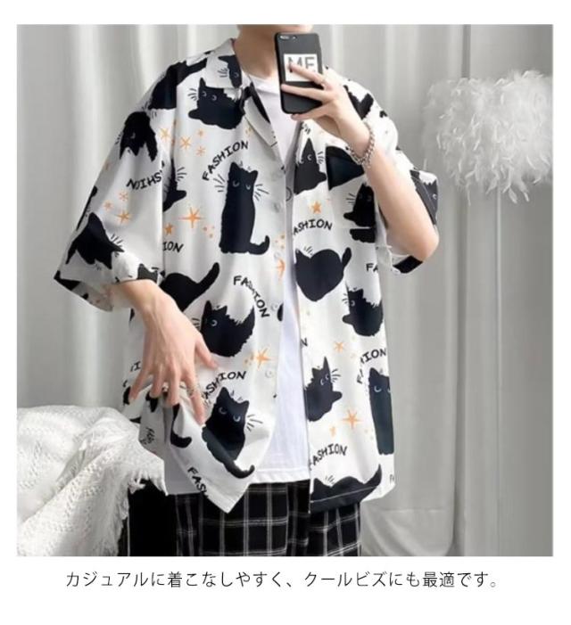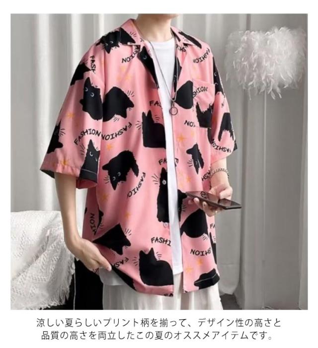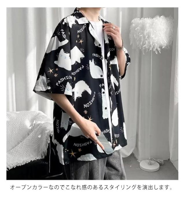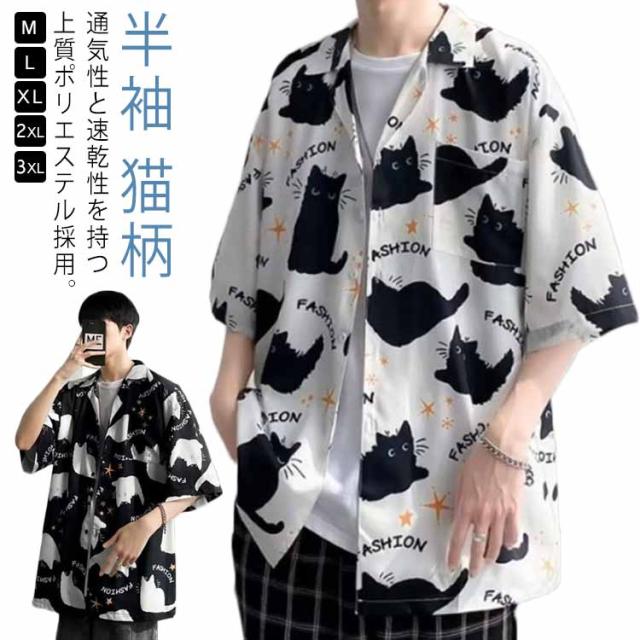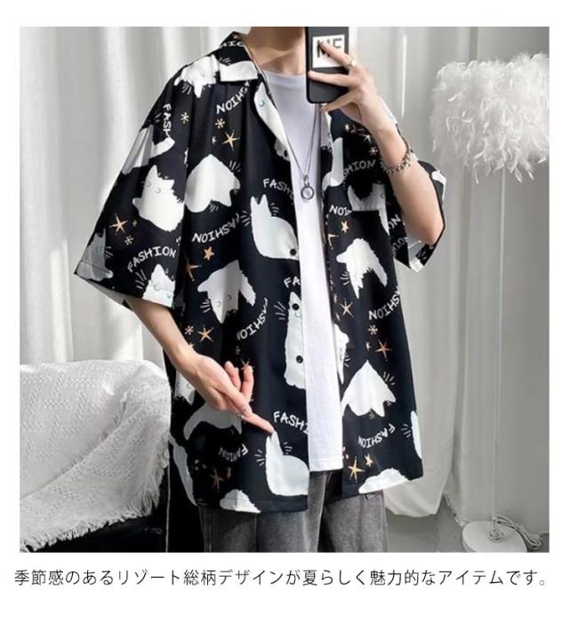 メンズ 半袖 ゆったり アロハシャツ プリント 猫柄 おしゃれ 開襟シャツ 薄手 速乾 夏 海 ストリート 原宿系 カジュアルシャツ 大きいサイズ 夏服