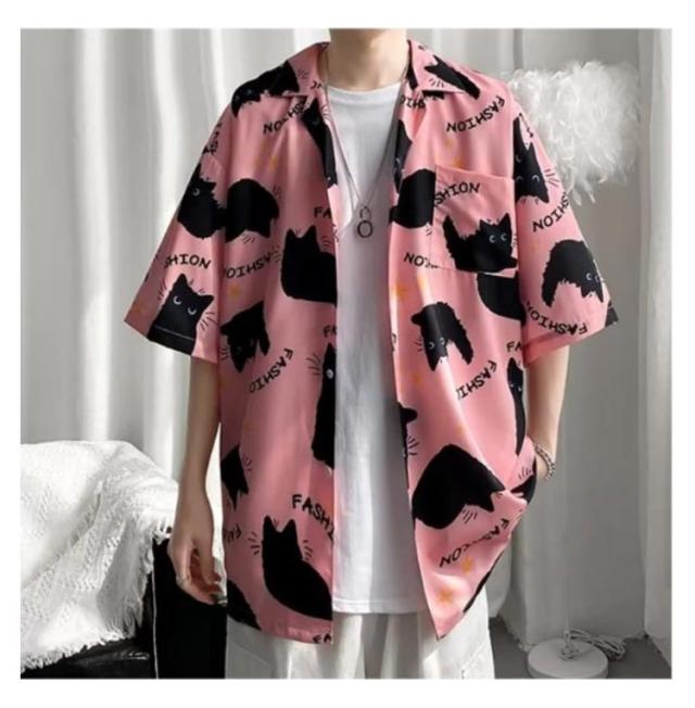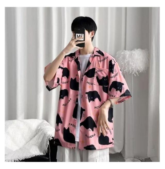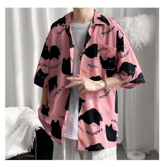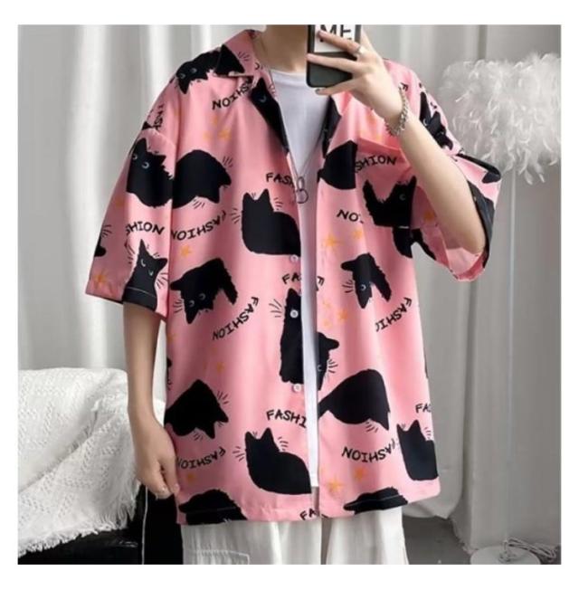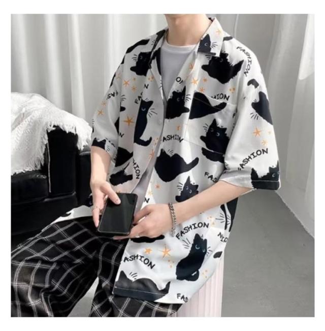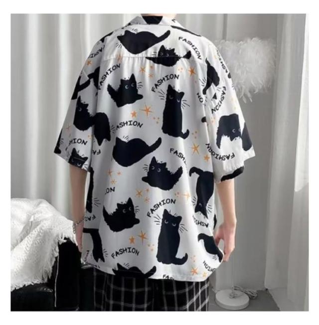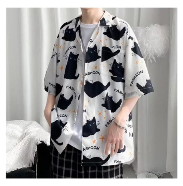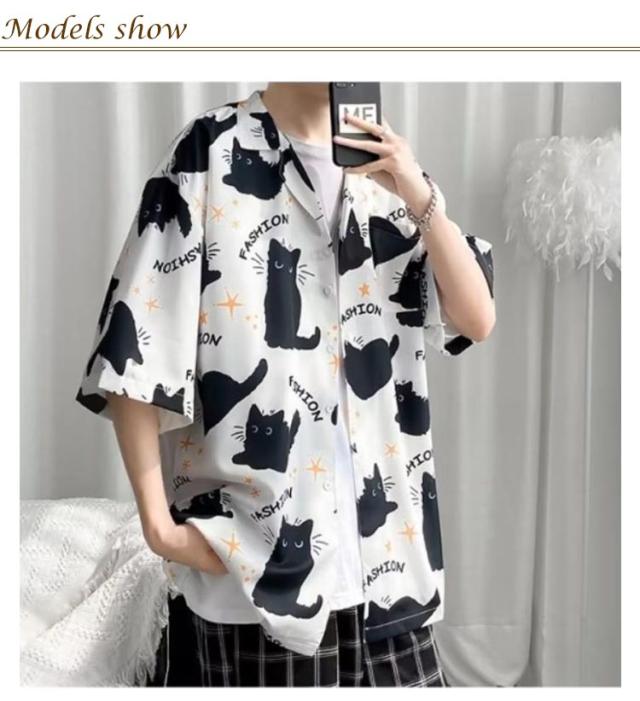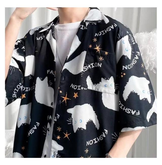 メンズ 半袖 ゆったり アロハシャツ プリント 猫柄 おしゃれ 開襟シャツ 薄手 速乾 夏 海 ストリート 原宿系 カジュアルシャツ 大きいサイズ 夏服