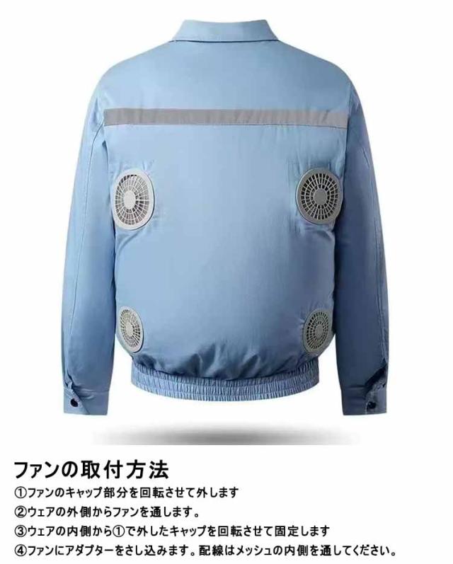 | 猛暑の夏に、工場や屋外作業などエアコンの使用できない環境で作業服 ファン*4、ケーブル、ベストのセット ウェアの内側にはメッシュ素材など通気性の良い生地が使用されているため、吹き抜ける風によって効率よく汗が乾いていきます。 ファンの風を服の中にしっかり閉じ込めることで、より効果的に涼しさを感じることができながら、急速な蒸発と発汗で、汗や発疹などの皮膚疾患の減少にもつながります 高密度で織りあげることにより、防風性を高め、着心地、肌触りも抜群です 人に備わっている発汗による冷却システムを最大限サポ一トします。 猛暑、熱中症対策・作業効率アップ・省エネ効果に! 日焼け防止効果は最高値UPF50+、日当たりで肌が赤みやはがれの現象がなくなり、皮膚をダメージから守ります 工場内、工事現場、ご家庭、アウトドア、野外、農作業、運送、建築業界、出前、配達、イベントスタッフ、が難しい環境の作業に最適など様々なシーンで活躍します。 ファンの取付方法 ?ファンのキャップ部分を回転させて外します ?ウェアの外側からファンを通します。 ?ウェアの内側から?で外したキャップを回転させて固定します ?ファンにアダプターをさし込みます。配線はメッシュの内側を通してください。 | |