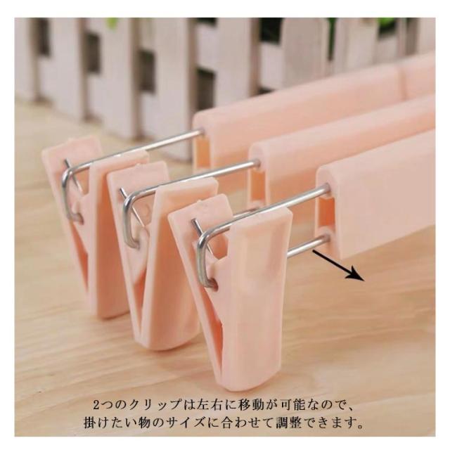 | 衣類のサイズに合わせて位置を調整できるので、子供から大人まで様々な衣類を掛けられます。 ピンチ先端には生地に優しいすべり止めが付いており、衣類を優しく挟んでくれて、滑り落ちなど心配がありません。 高品質PP素材を採用され、曲げても折れにくい、強い耐荷重性、重い服でも使用可能です。 強力なクリップで重たい洗濯物やボトムスでも落ちずにしっかり挟んでくれます。 2つのクリップは左右に移動が可能なので、掛けたい物のサイズに合わせて調整できます。 ズボン、スカート、マフラーなどに適用するだけでなく、水着とタオルや雑巾でも大活躍です。 | |