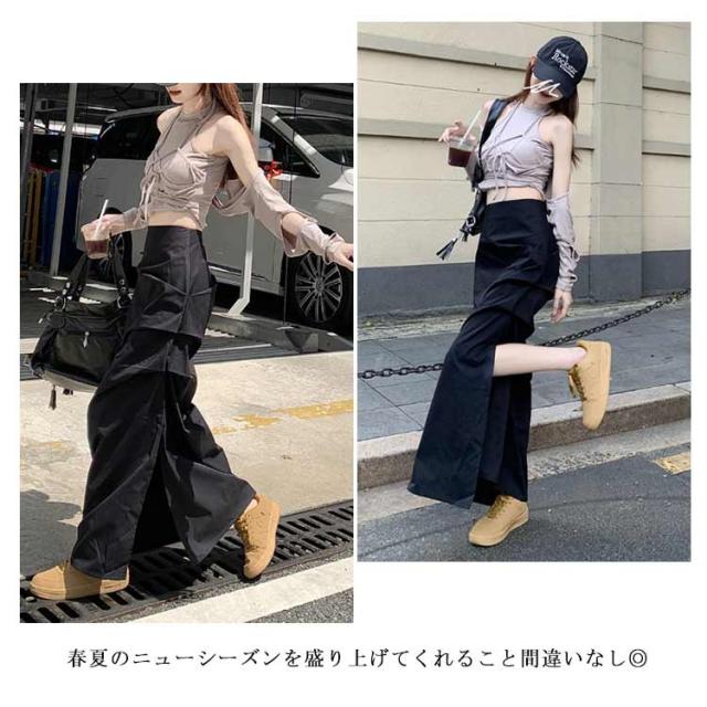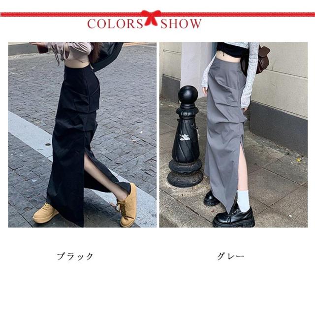 ミリタリースカート サイドスリット カーゴスカート レディース スカート ロングスカート マキシ丈 タイト スカート ハイウエスト くしゅくしゅ 春 夏 秋 ミリタリー ストリート カジュアル ブラック 黒 グレー 【送料無料】