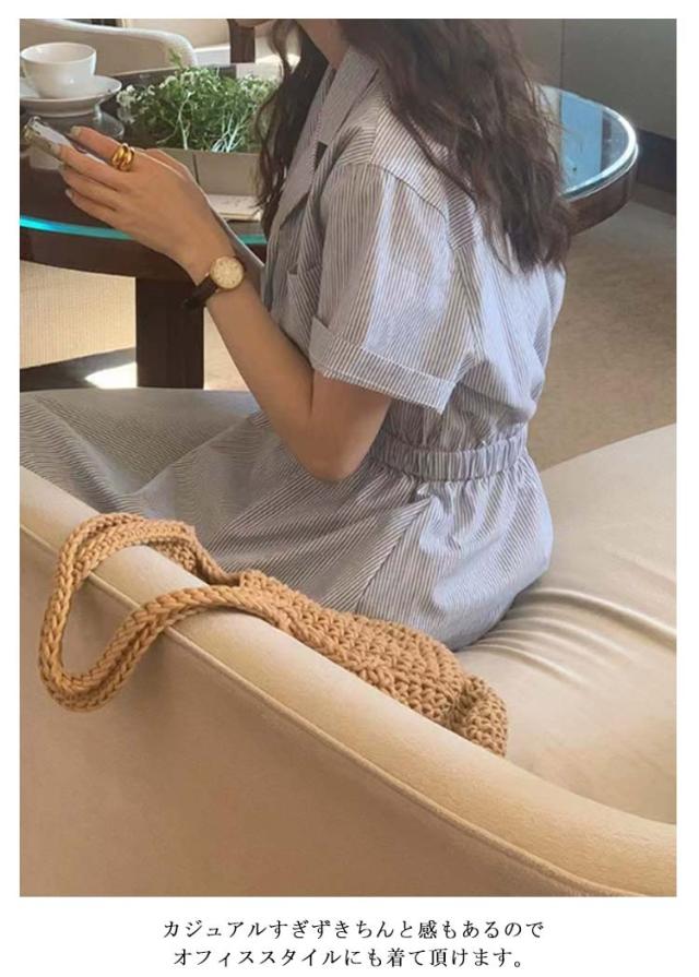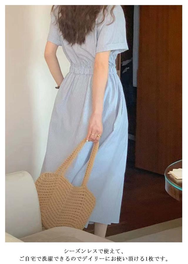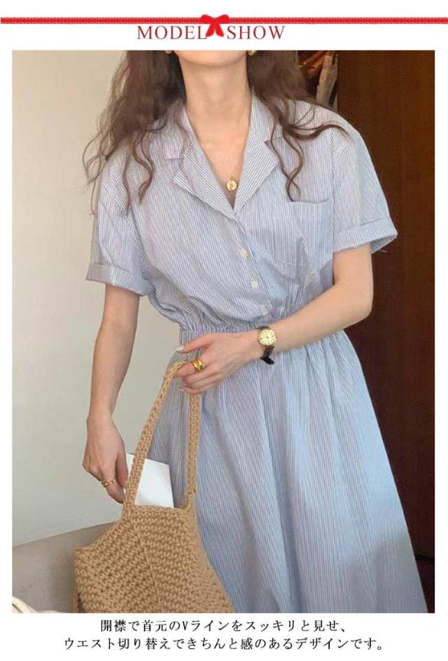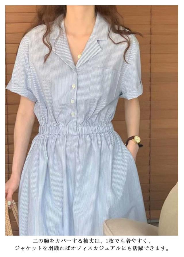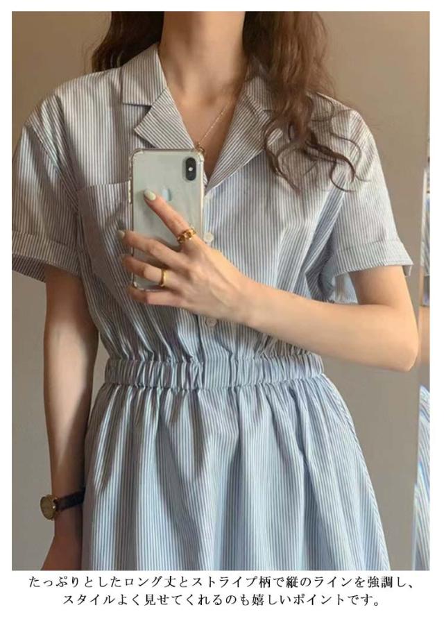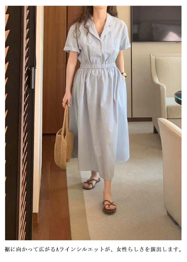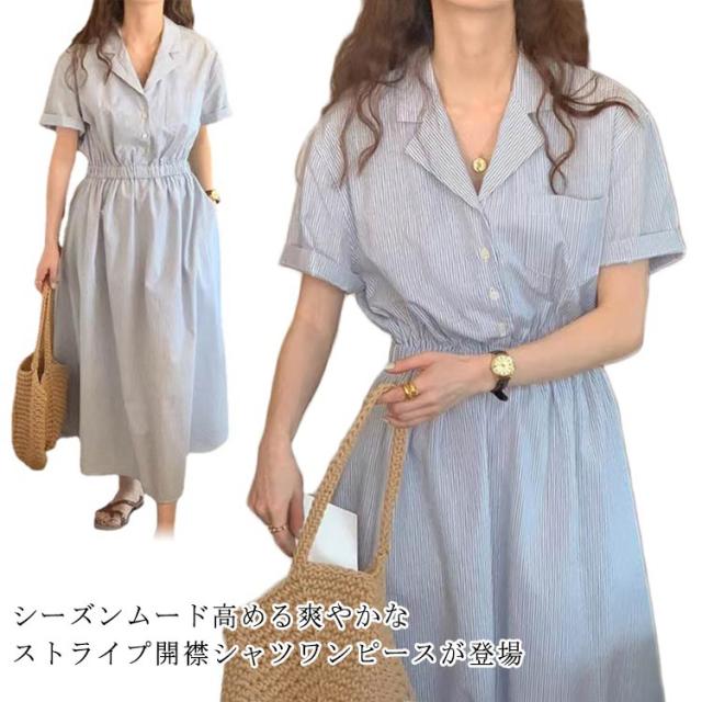 シャツワンピース ストライプ レディース 40代 開襟シャツ ワンピース 半袖 ロングワンピース ポケット付き シャツワンピ ロング シャツワンピース ギャザー入り aライン ゆったり 着?せ 30代 50代 通勤 オフィス カジュアル 【送料無料】