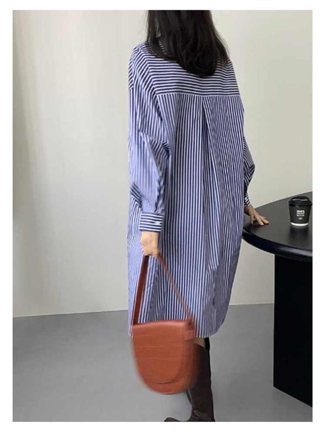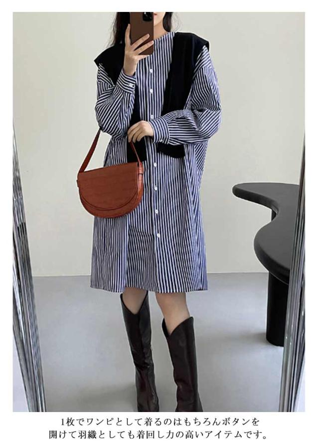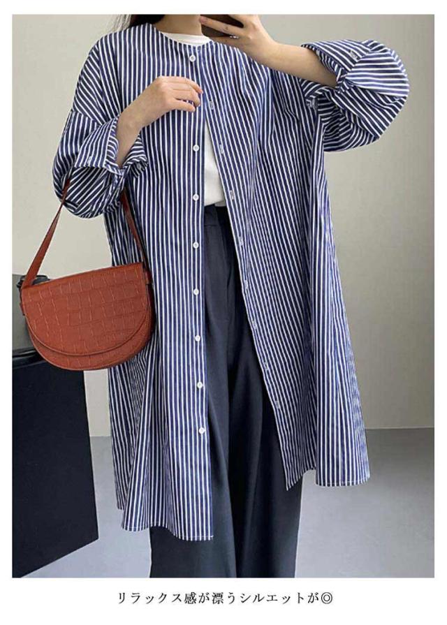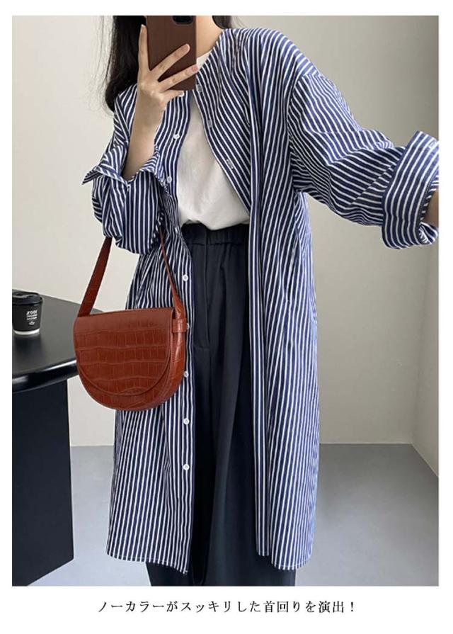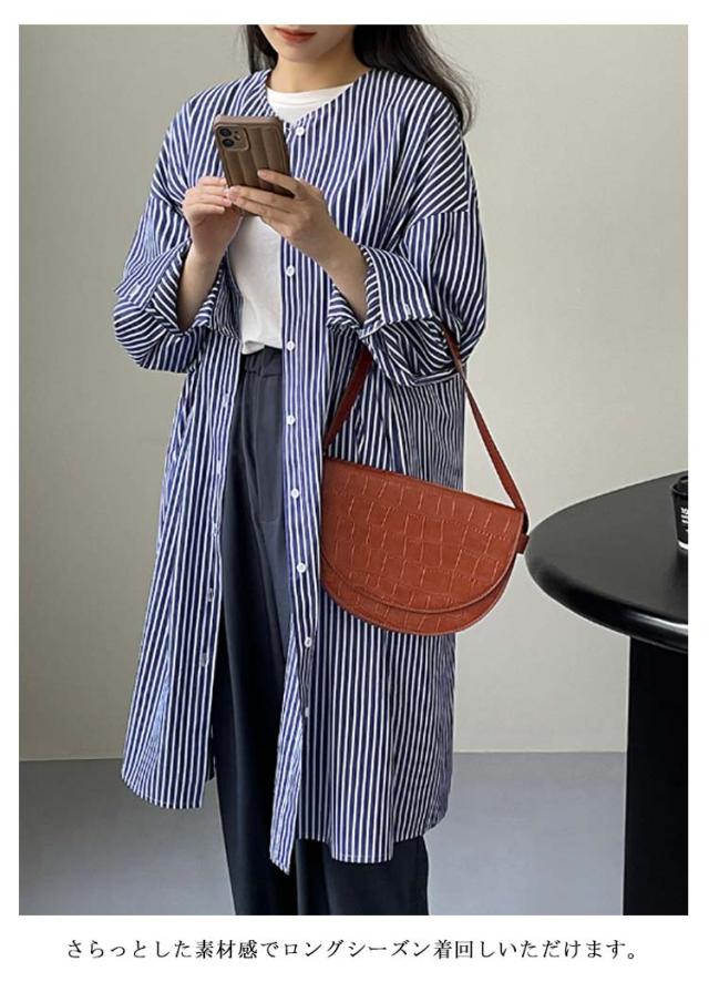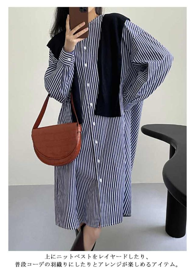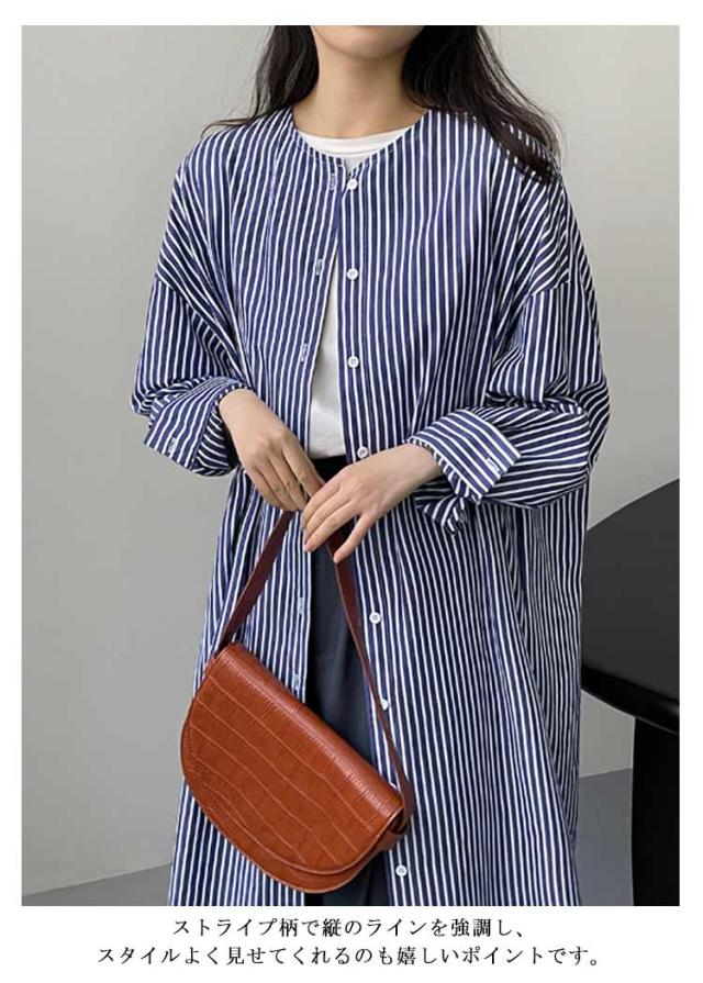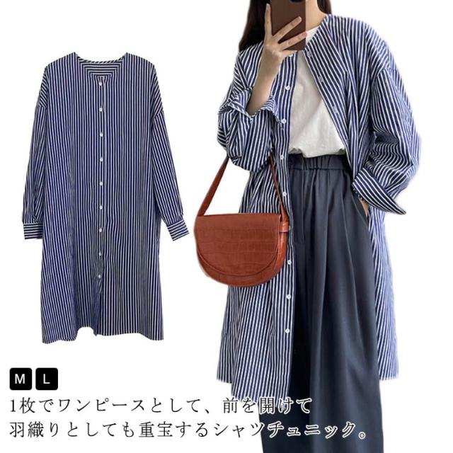 シャツワンピース ストライプ 長袖 レディース ノーカラー シャツ チュニック ロングワンピース ポケット付き シャツワンピ 春 夏 カーディガン 羽織り 冷房対策 オーバーサイズ 着?せ 30代 40代 50代 通勤 オフィス カジュアル