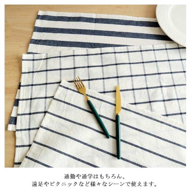 | 年齢や性別を問わず使えるストライプ柄とチェック柄のランチクロス(3枚セット)です。 素材は肌触りの良い綿素材を使用。洗濯機使用可能なので、汚れてしまってもお手入れが簡単です。 お弁当箱を包んだり、テーブルクロス、給食用ナフキンとしてもお使いいただけます。 通勤や通学はもちろん、遠足やピクニックなど様々なシーンで使えます。 | |