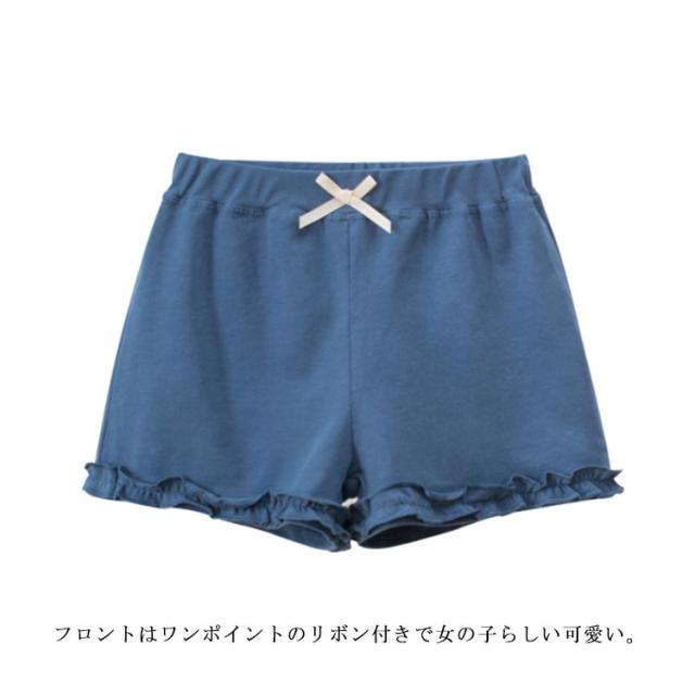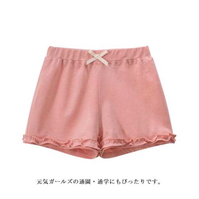 | 裾フリルが女の子可愛いショートパンツ。 肌触り優しい綿素材、敏感肌のお子様でも安心。 ウェスト平ゴムで窮屈感なく、ラクラクな着心地◎ フロントはワンポイントのリボン付きで女の子らしい可愛い。 元気ガールズの通園・通学にもぴったりです。 | |