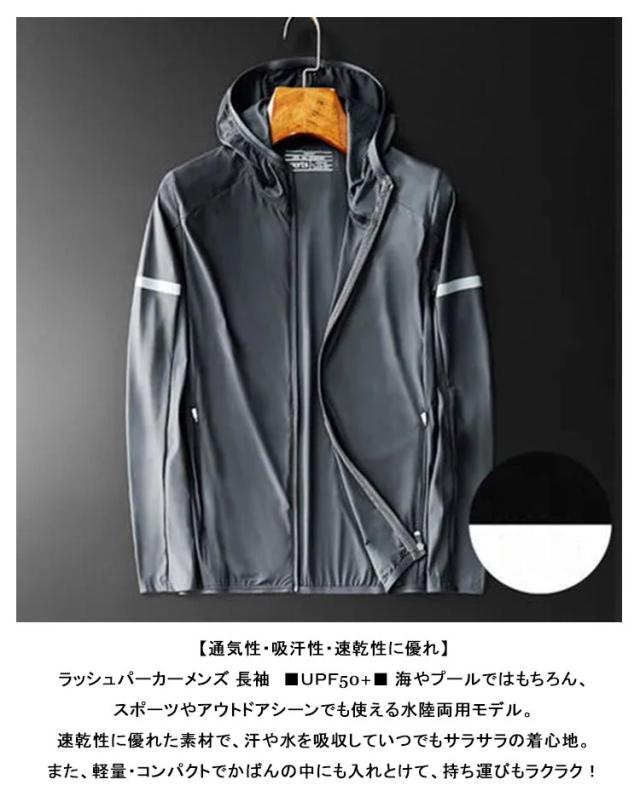 | 【接触冷感】冷感生地を使用!一般の蒸し暑いポリエステル生地ではなく、独特な紡織技術で織った通気性と速乾性に優れな生地を使用、汗ばむでも蒸れません。伸縮性がある生地のため、ストレスなく着用できます。 【通気性・吸汗性・速乾性に優れ】ラッシュパーカーメンズ 長袖 ■UPF50+■ 海やプールではもちろん、スポーツやアウトドアシーンでも使える水陸両用モデル。速乾性に優れた素材で、汗や水を吸収していつでもサラサラの着心地。また、軽量・コンパクトでかばんの中にも入れとけて、持ち運びもラクラク! 【お手軽簡単UV対策】羽織るだけでUV対策!お肌に有害な紫外線を98%以上カット!シンプルなカラーだから幅広い方にオススメ!様々なシーンで大活躍フード付きラッシュガード!メンズ パーカー、肌にさまざまな影響を与える紫外線から肌を守るために欠かせないアイテムです。 【着る日焼け止め】フロントファスナーはフードの端まで伸ばしているので、ケアしづらい首もラッシュガード着用で肌を守ります。用途やお好みでお選びください、あなたに合うラッシュガードが必ず見つかります。 【幅広く着用できる】様々なシーンで使える1着あれば安心の万能パーカーです。海やプールに行く時、水着のアウターとしてはもちろん、通勤通学の時も日焼け止め用服としてtシャツの上に羽織るのもいいですし、寒すぎる冷房の中に必須のアウターとしても便利です。 | |