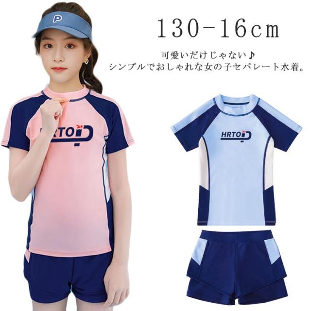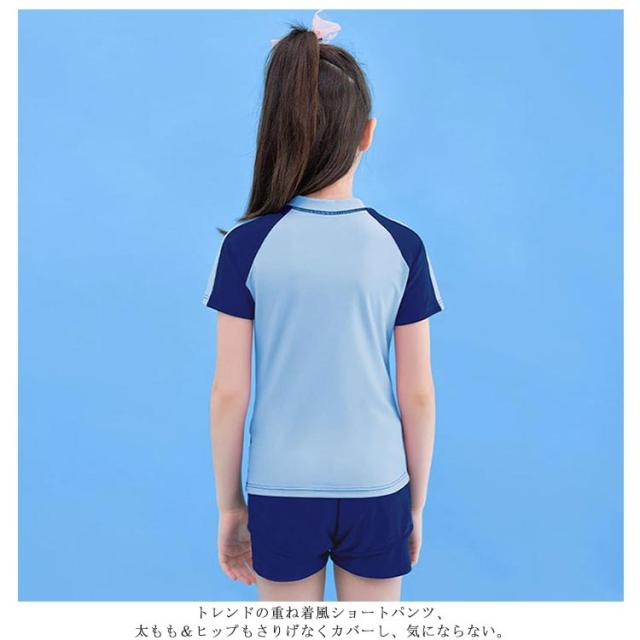 子供 ジュニア 水着 女の子 ジュニア 高校生 小学生 中学生 スクール水着 セパレート 水着 キッズ 水着 半袖 ショートパンツ 上下セット 配色 ラッシュガード 中学生 ガールズ スクール 130-16cm