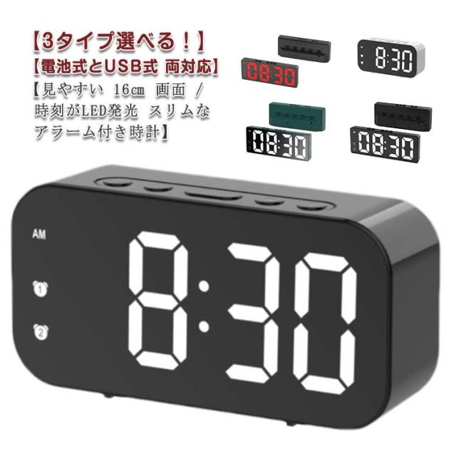 LED デジタル時計 時計 デジタル 置き時計 おしゃれ 卓上 時計 光る 電池式 USB式 両対応 置時計 温度 日付 アラーム付き ライト 目覚まし インテリア 薄型 デジタルクロック 黒 シンプル 夜間点灯 電池