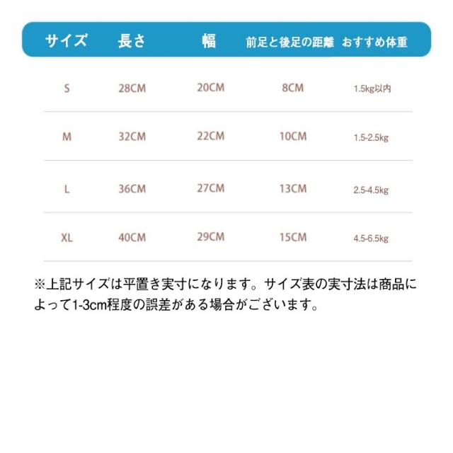 | サイズについての説明 | 【S】長さ28 幅20 前足と後足の距離8 おすすめ体重1.5kg以内 【M】長さ32 幅22 前足と後足の距離10 おすすめ体重1.5-2.5kg 【L】長さ36 幅27 前足と後足の距離13 おすすめ体重2.5-4.5kg 【XL】長さ40 幅29 前足と後足の距離15 おすすめ体重4.5-6.5kg ※上記サイズは平置き実寸になります。サイズ表の実寸法は商品によって1-3cm程度の誤差がある場合がございます。 |