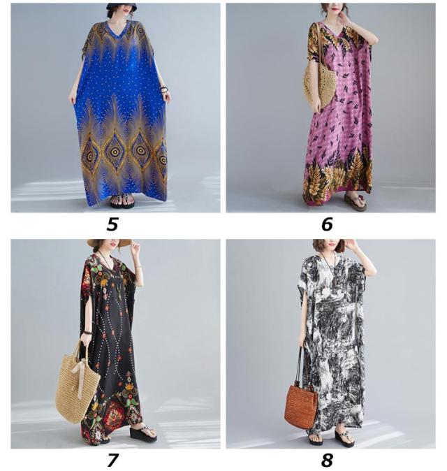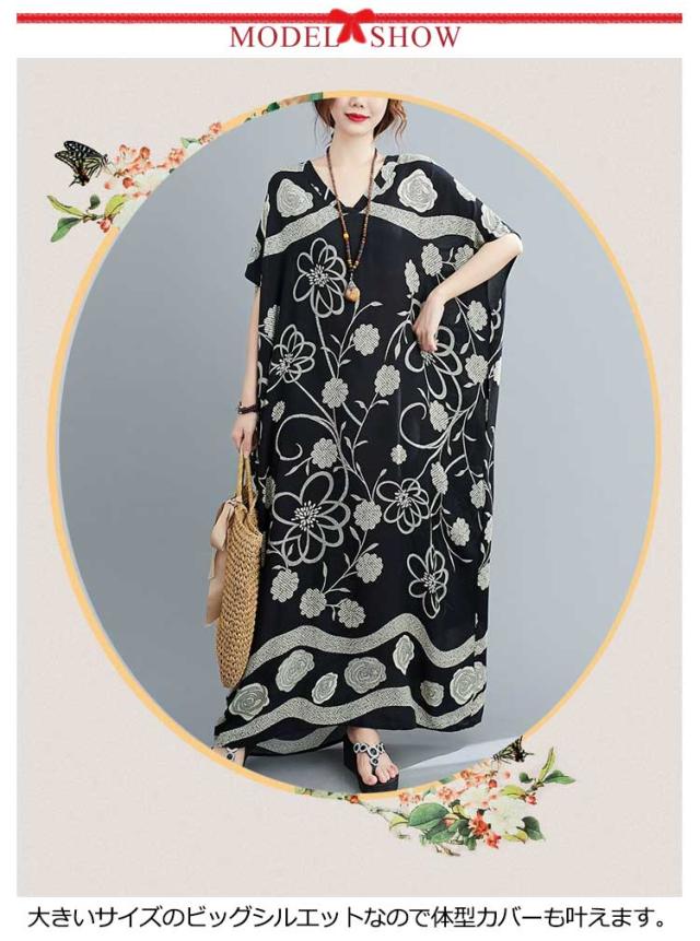 ワンピース ドルマンスリーブ 半袖 ロング レディース ロングワンピース マキシ丈 Vネック tシャツワンピース 花柄 幾何学柄 マルチ柄 マキシワンピース ビッグシルエット 体型カバー ポケット付き フリーサイズ マタニティウェア 【送料無料】