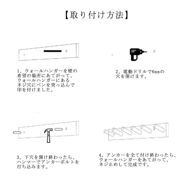 | 天然木の風合い漂うウォールハンガー 選べる6連・5連・4連タイプ 木の質感、色味、触り心地をそのまま楽しめる天然木仕様。フックにも天然木を使用しており温かみのあるホッとする空間に。 壁と一体となり場所をとらないので、玄関や廊下など限られたスペースにも気軽に使えて壁面の有効活用に! カバンや帽子など、いつも使うアイテムを掛けておけば、家の出入りも動作がスムーズ。 【取り付け方法】 1、ウォールハンガーを壁の希望の場所にあてがって、ウォールハンガーにあるネジ穴にペンを突っ込んで印を付けました。 2、電動ドリルで6mmの穴を開けます。 3、下穴を開け終わったら、ハンマーでアンカーボルトを打ち込みます。 4、アンカーを全て付け終わったら、ウォールハンガーをあてがって、ネジ止めして完成です。 | |