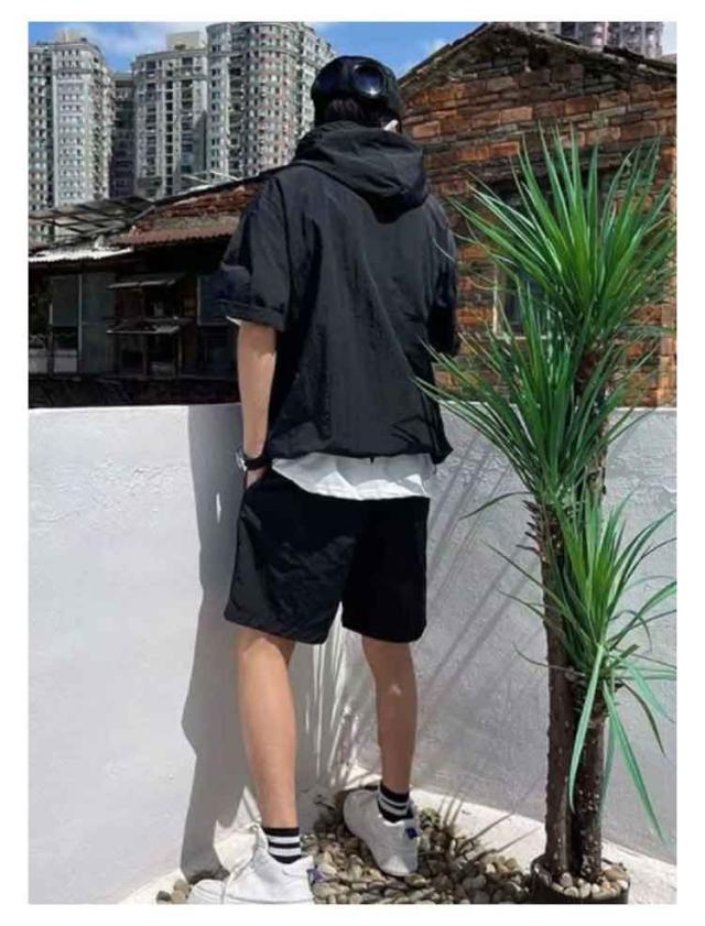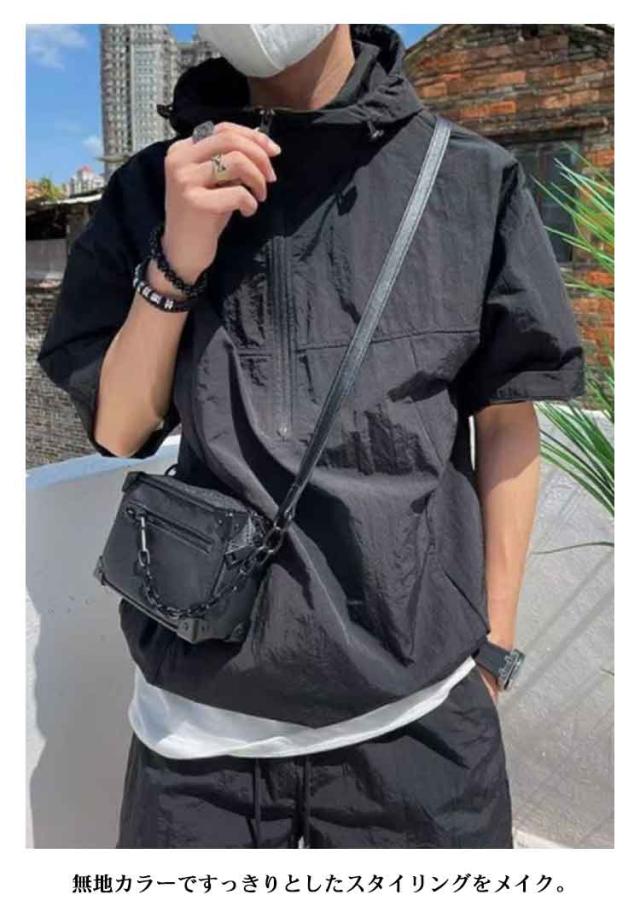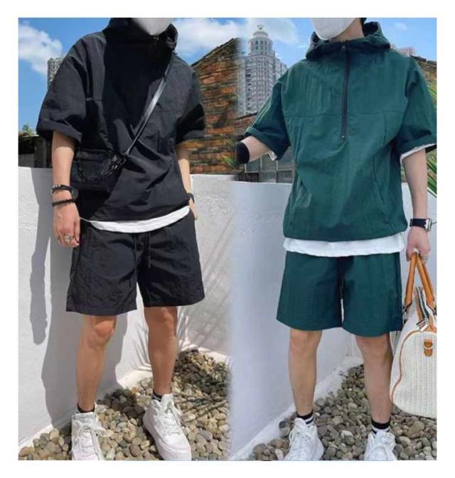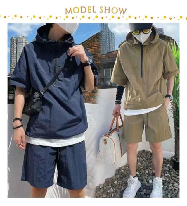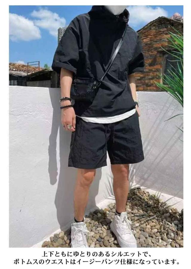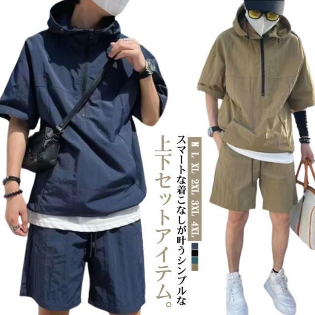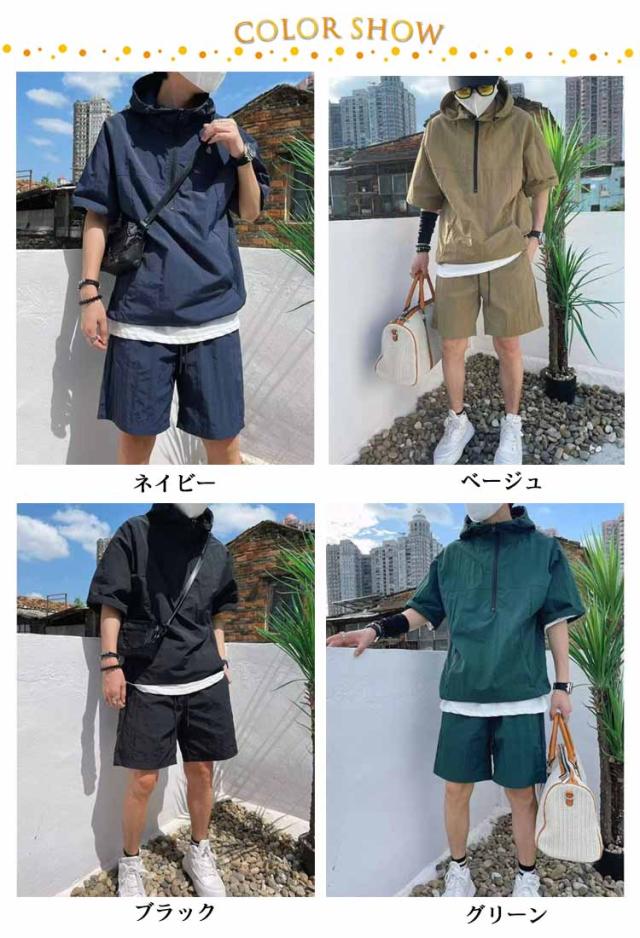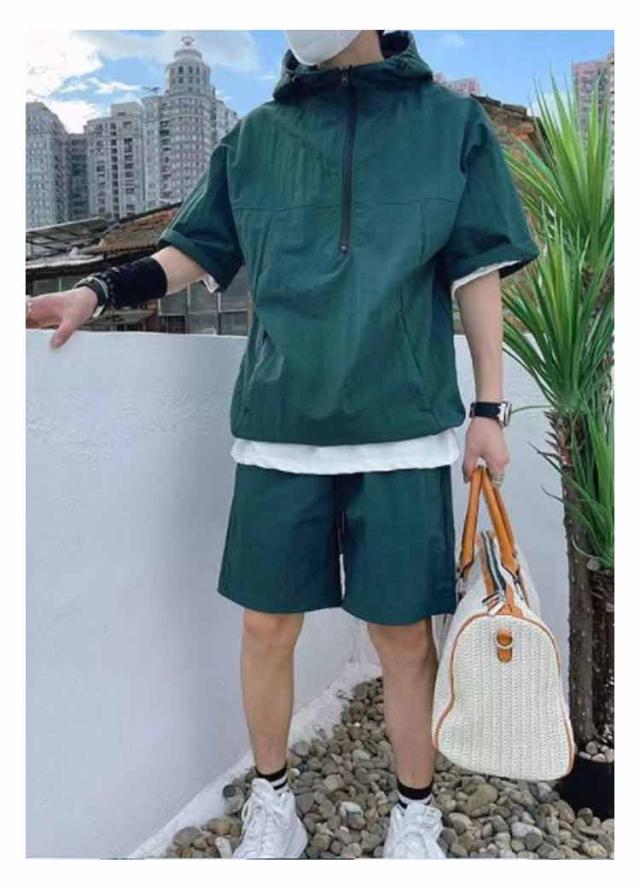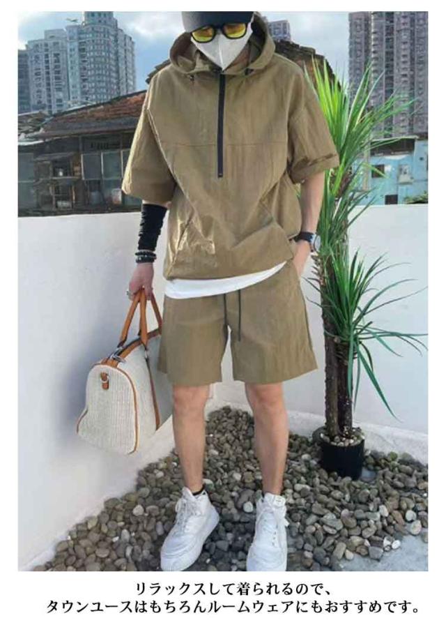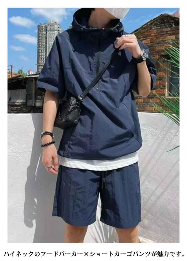 半袖 パーカー セットアップ メンズ ハイネック ハーフジップ パーカー ショートパンツ 上下セット 2点セット フード付き プルオーバー ゆったり ハーフパンツ 短パン 半ズボン リラックス シンプル キレイめ カジュアル ストレート アメカジ 清涼 無地 春夏 送料無料