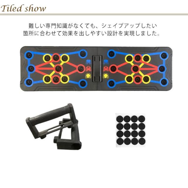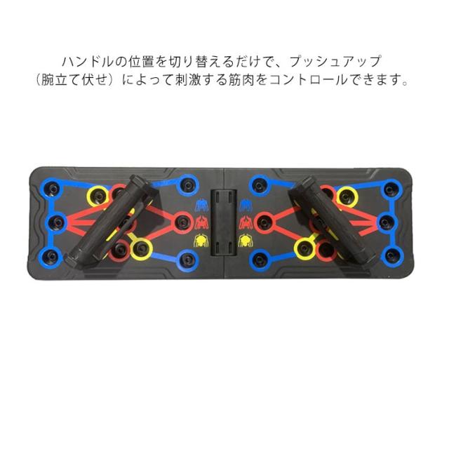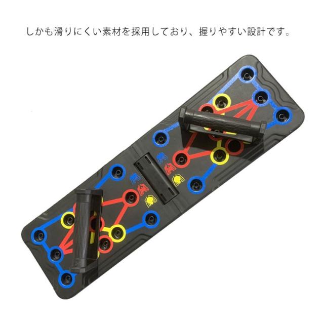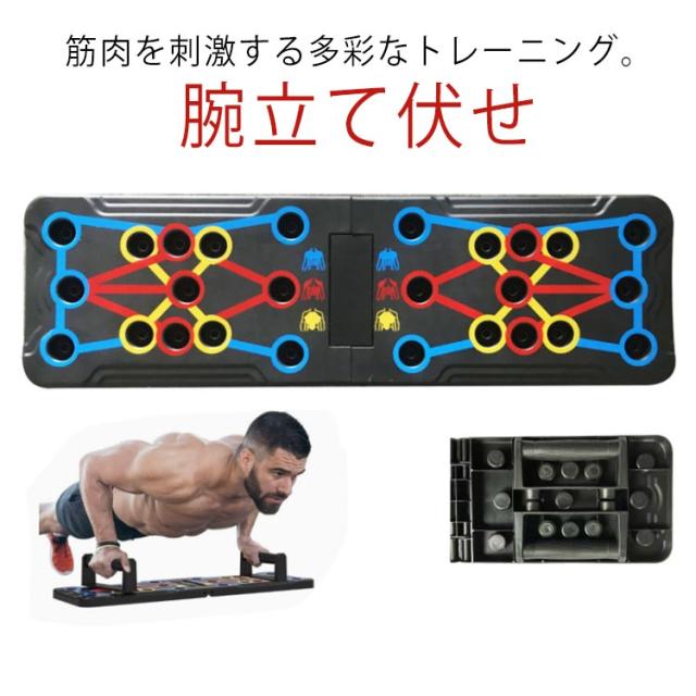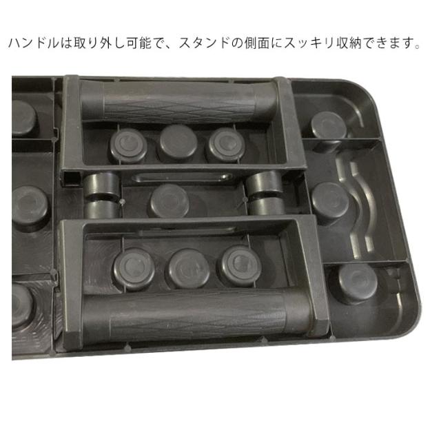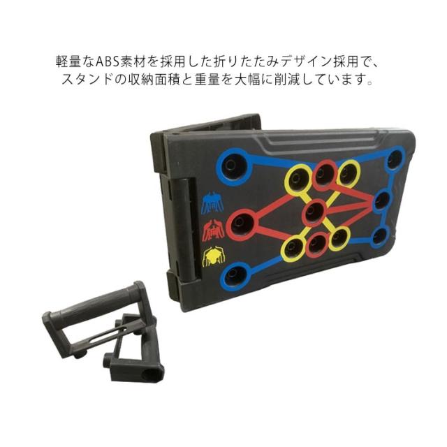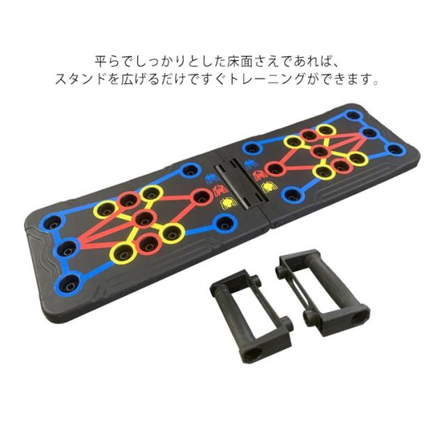 | 筋肉を刺激する多彩なトレーニング。 ハンドルの位置を切り替えるだけで、プッシュアップ(腕立て伏せ)によって刺激する筋肉をコントロールできます。 難しい専門知識がなくても、シェイプアップしたい箇所に合わせて効果を出しやすい設計を実現しました。 軽量なABS素材を採用した折りたたみデザイン採用で、スタンドの収納面積と重量を大幅に削減しています。 ハンドルは取り外し可能で、スタンドの側面にスッキリ収納できます。 しかも滑りにくい素材を採用しており、握りやすい設計です。 平らでしっかりとした床面さえであれば、スタンドを広げるだけですぐトレーニングができます。 | |