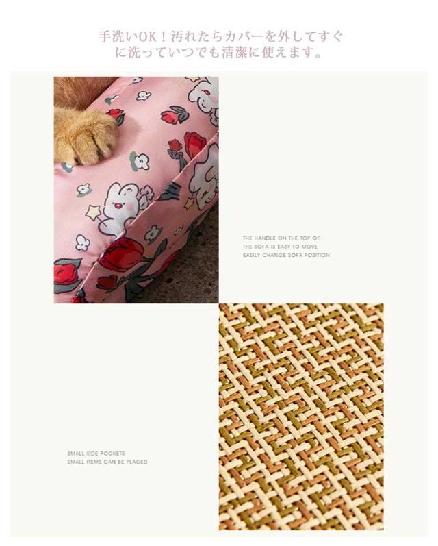 | 通気性がよくひんやりと過ごせる夏用のペットベッドです。 座面が触れた瞬間ひんやり心地いい籐編みで暑い時期も快適に! ふかふか枕付きで、頭やあごをのせて気持ちよく眠れます。 手洗いOK!汚れたらカバーを外してすぐに洗っていつでも清潔に使えます。 | |