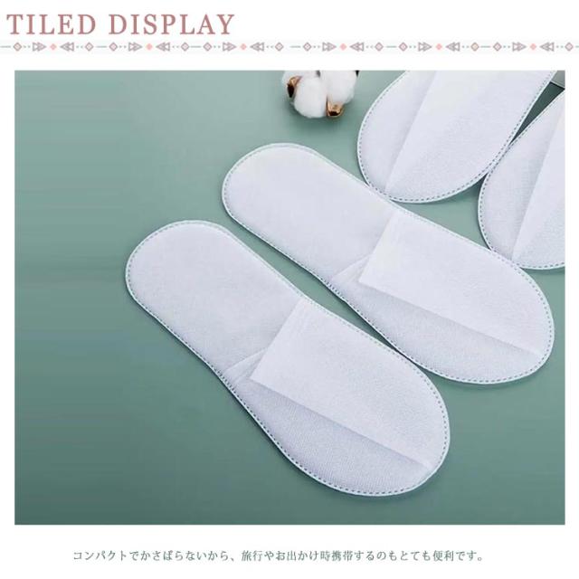 | 100足セット!いつも清潔な状態で保管できる使い捨てスリッパ アッパー部分は通気性抜群の不織布素材、爽やかな履き心地を実現♪ 底には滑りにくい素材を使用しているから安心◎ 安くてお得な100足セット、ホテル、エステサロン、病院、会社、学校、民泊など業務用はもちろん、ご自宅用、来客用など幅広くご使用いただいてます。 コンパクトでかさばらないから、旅行やお出かけ時携帯するのもとても便利です。 | |