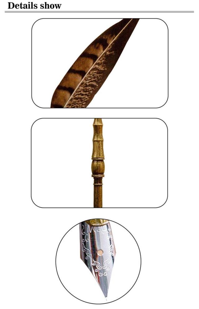 | アンティーク調の羽根ペンセット。ギフトボックス付き 文房具として使用する以外に、アンティーク調のインテリア雑貨としてもお使いいただけますので、お部屋を洋風にしたいときのアイテムとしても役立ちます。 大型の鳥の羽を加工して先端にペン先を取り付けていますので、その先端にインクをつけることで文字を書くことができます。 使い方は簡単:インクボトルが手元にある限り、このディップペンを使って思考を書き留めたり、いつでも絵を描くことができます。 お手入れ簡単:使用後は水ですすぎ、キッチンペーパーで乾かしてください。 | |
