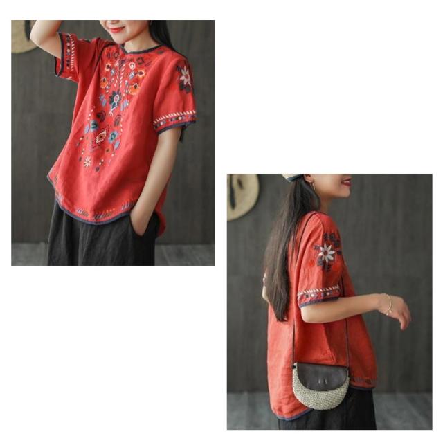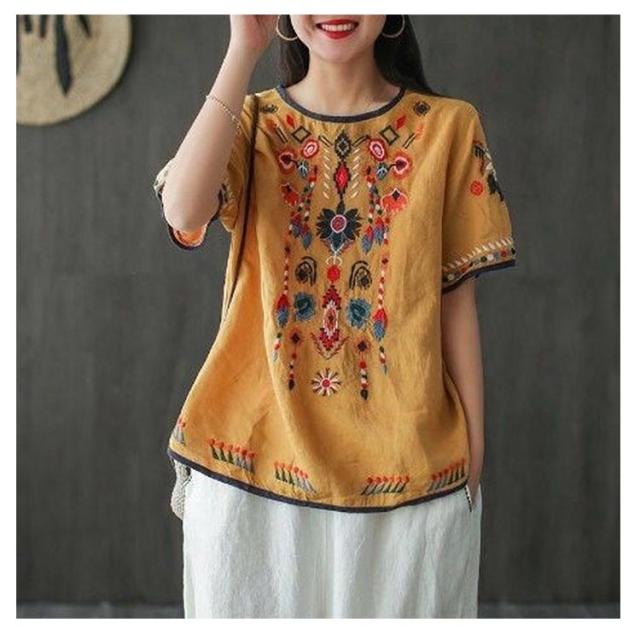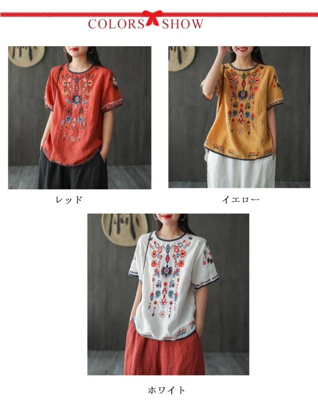 【送料無料】刺繍 ブラウス チュニック Tシャツ アジアン 綿麻 麻 リネン 涼しい Tシャツ トップス 花 刺繍 半袖 ハーフ袖 エスニック スクエアネック プルオーバー 薄手 カットソー レッド イエロー ホワイト 大きいサイズ
