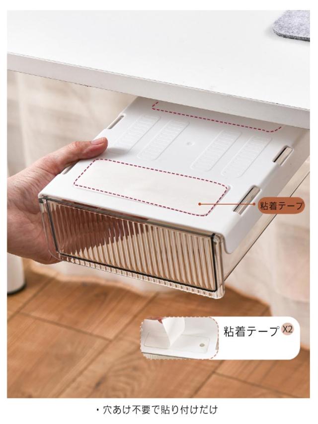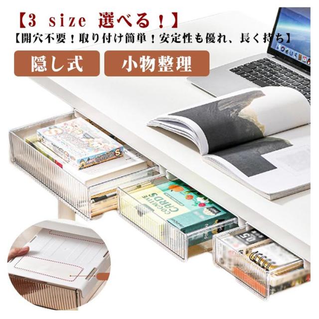 | 【3 size 選べる!】 【開穴不要!取り付け簡単!安定性も優れ、長く持ち】 ・お持ちのデスクや棚等に引き出しをプラス ・筆記用具などが片付く ・穴あけ不要で貼り付けだけ ・ダイニングテーブルや、リモートワークのデスクなどにおすすめ。 | |