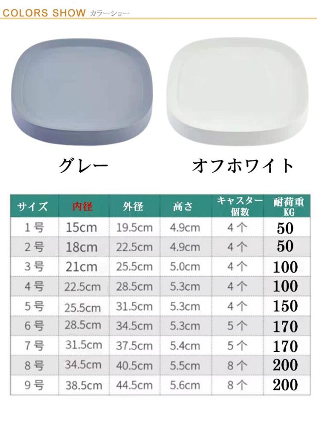 | キャスターが見えないスッキリしたデザイン、お部屋をモダンな雰囲気に演出する鉢皿。 前後左右スムーズに移動できるので、室内で観葉植物を育てるときに大変な掃除や模様替えなどが手軽に行えます。 耐荷重抜群で、植木鉢を乗せることはもちろん、空気清浄機や加湿器、水や米びつなど重たいものも移動できるマルチスタンドとしても活躍してくれます。 水をこぼしてしまった場合でも、ふちの立ち上がりが、水を受け止めてくれるので安心◎ インテリアに馴染みやすいオフホワイトとグレーの2色展開、お部屋の雰囲気や観葉植物のイメージに合わせて選べます。 ゴムと合金製のキャスター、静かに移動でき、耐久性も抜群! | |