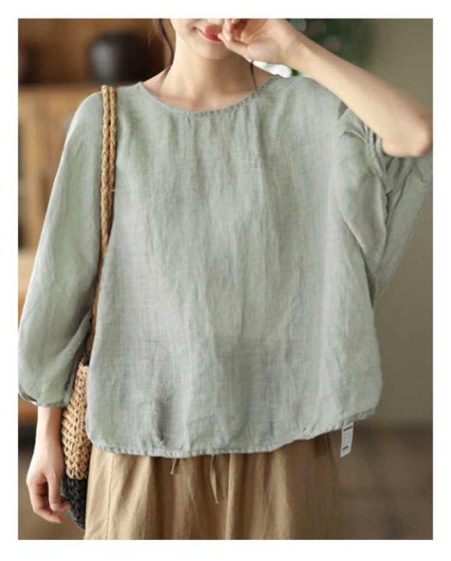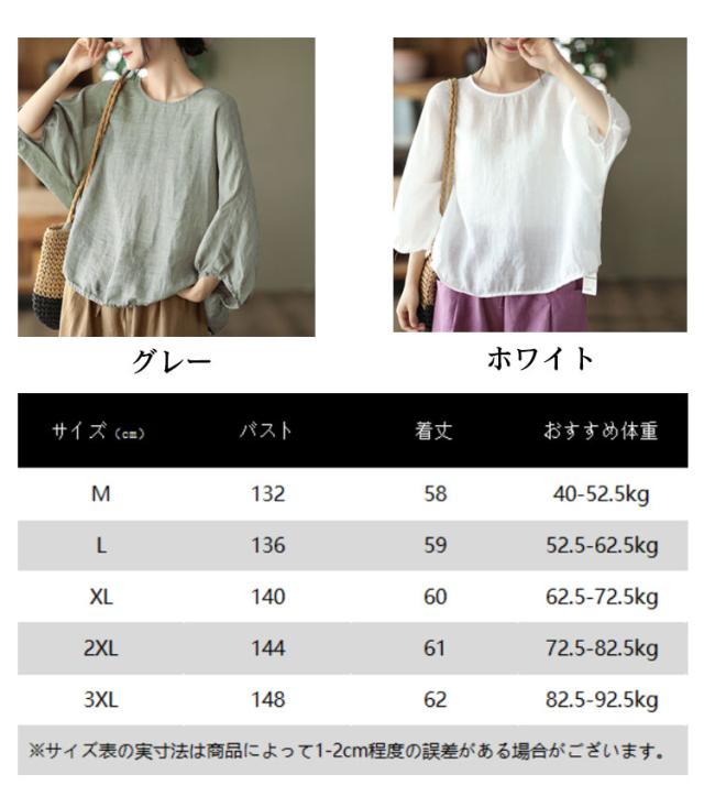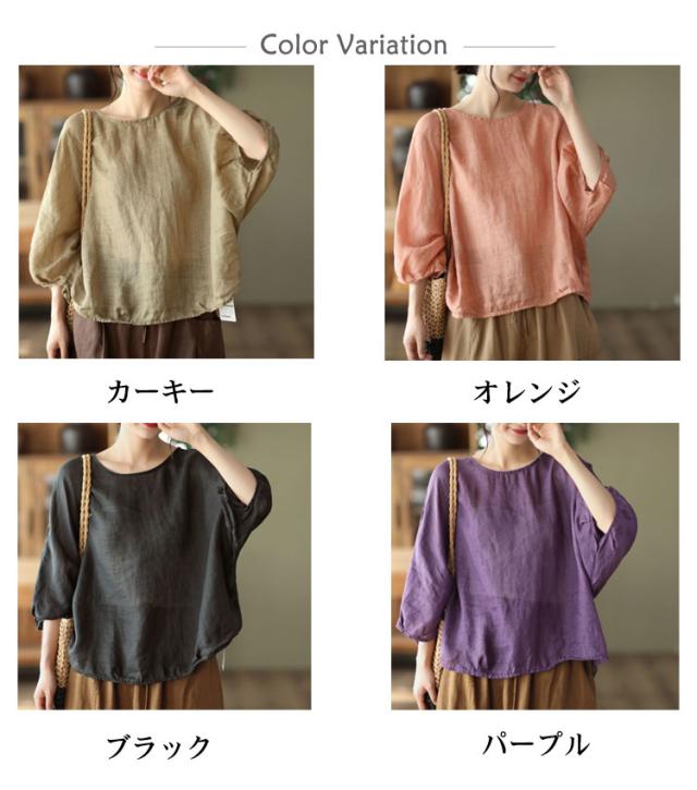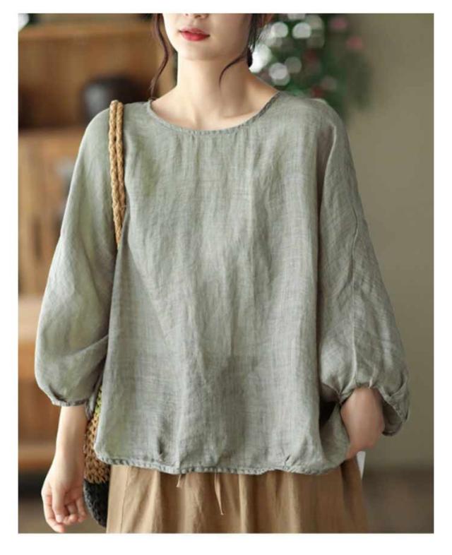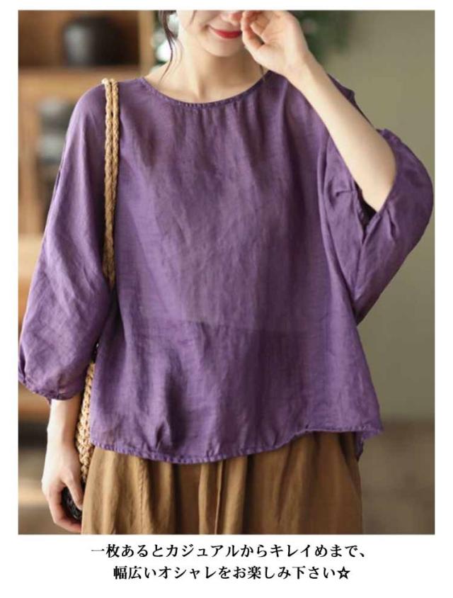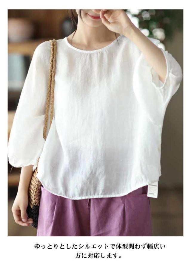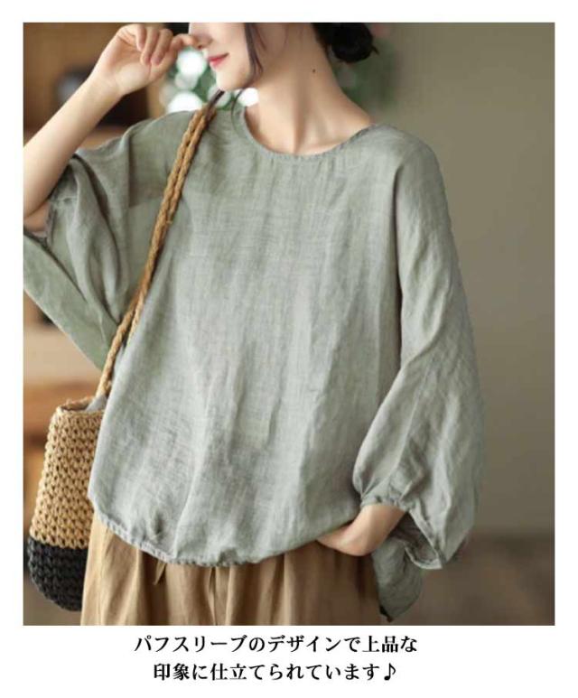 ブラウス 七分袖 シャツ レディース バルーン袖 綿麻 トップス 夏春 薄手 ふんわり おしゃれ ショート丈 ナチュラル 通勤 通学 クルーネック きれいめ カジュアル 可愛い 森ガール 大きいサイズ ゆったり 体型カバー プレゼント ギフト 送料無料 無地
