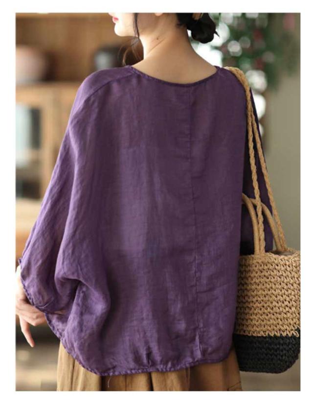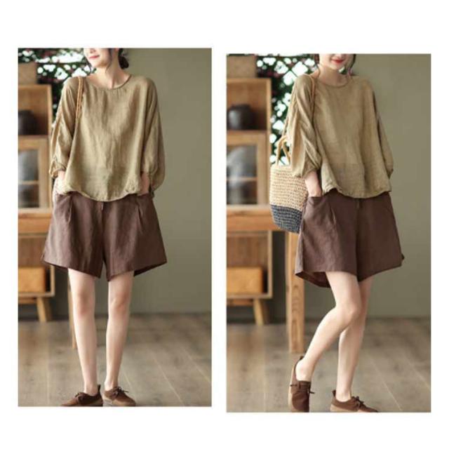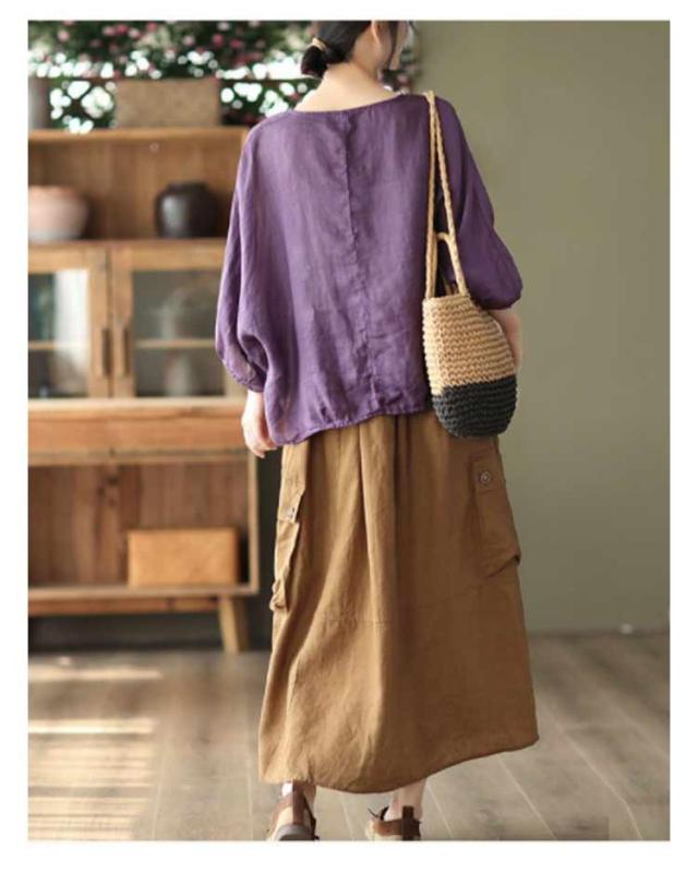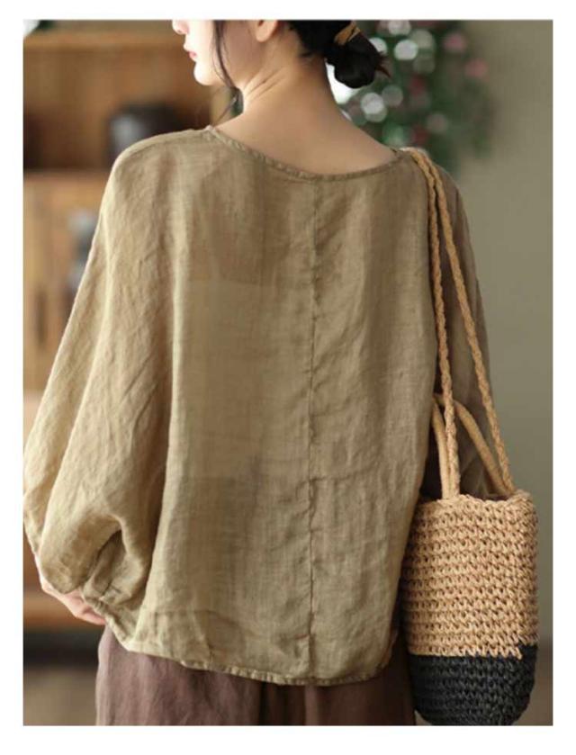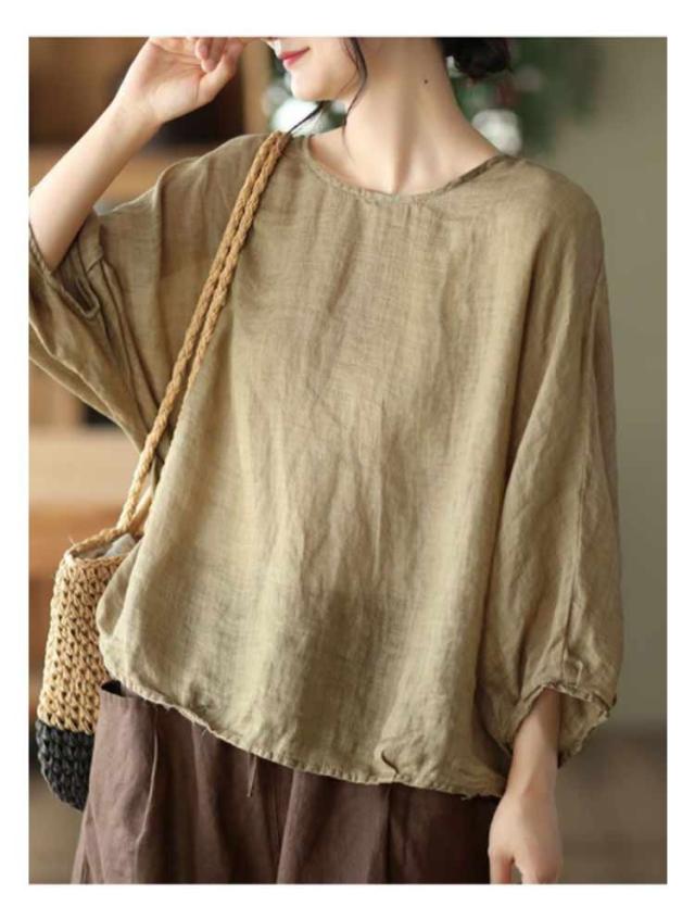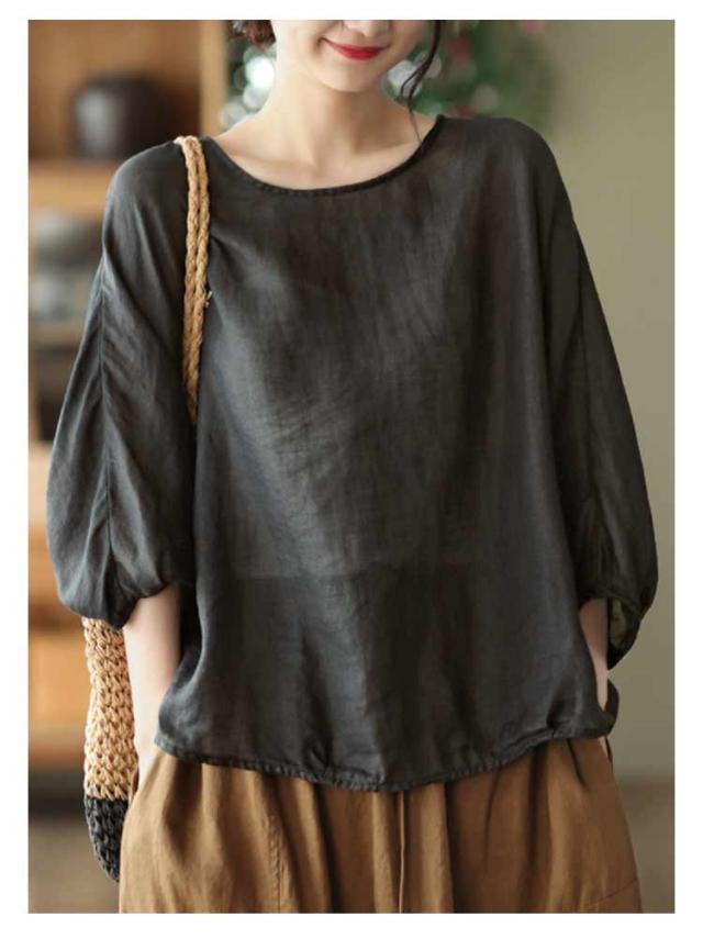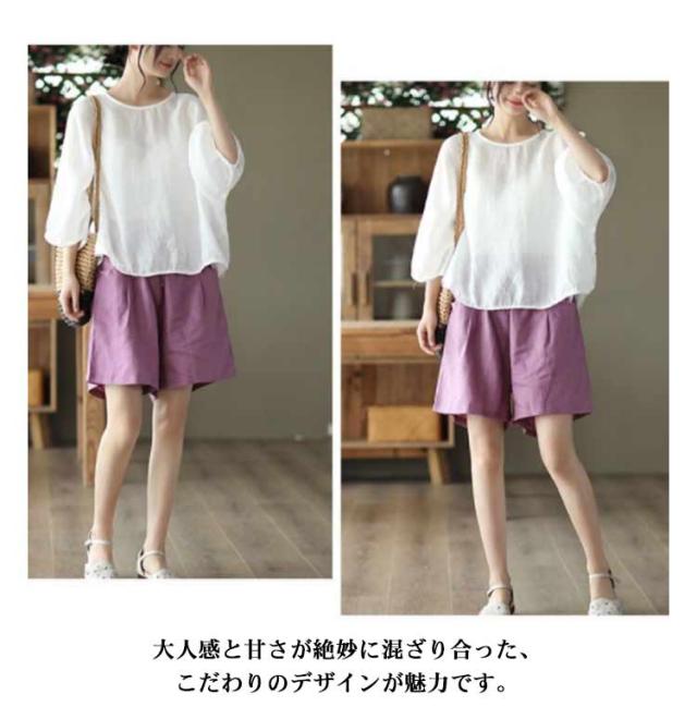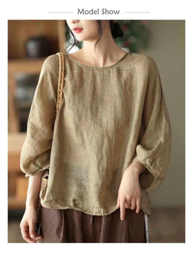 ブラウス 七分袖 シャツ レディース バルーン袖 綿麻 トップス 夏春 薄手 ふんわり おしゃれ ショート丈 ナチュラル 通勤 通学 クルーネック きれいめ カジュアル 可愛い 森ガール 大きいサイズ ゆったり 体型カバー プレゼント ギフト 送料無料 無地