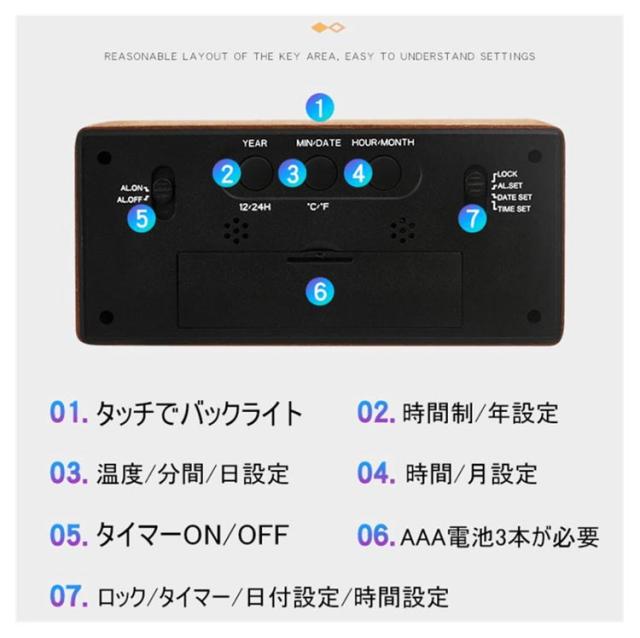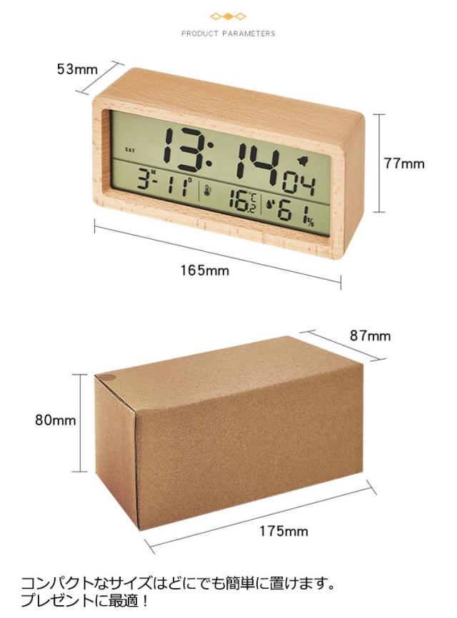 | 天然木製の卓上時計!多機能の置き時計! お部屋に馴染みやすい、ナチュラルで優しい木目が美しい、シンプルなデザイン。 時間表示だけでなく、タイマーで安心に目覚める。トップをタッチで簡単に鳴り止めます。 アラームは、鳴る間隔は5分間や、鳴る回数は3回、二度寝防止に最適! 鳴りっぱなしを防止ため、鳴り始めから1分後に自動停止。もちろん任意ボタンを押しても解除できます。 時刻や日付表示だけでなく、室内の温度管理もこの置き時計で一括管理してくれてとても便利! 暗く寝室に見えやすくように、トップをタッチするとバックライトが5秒間光ります。 見やすい大画面表示で、目に優しい時計です。曜日や日付や温度や湿度が表示されます。時間制は12Hと24Hが選べます。 コンパクトなサイズはどにでも簡単に置けます。プレゼントに最適! | |