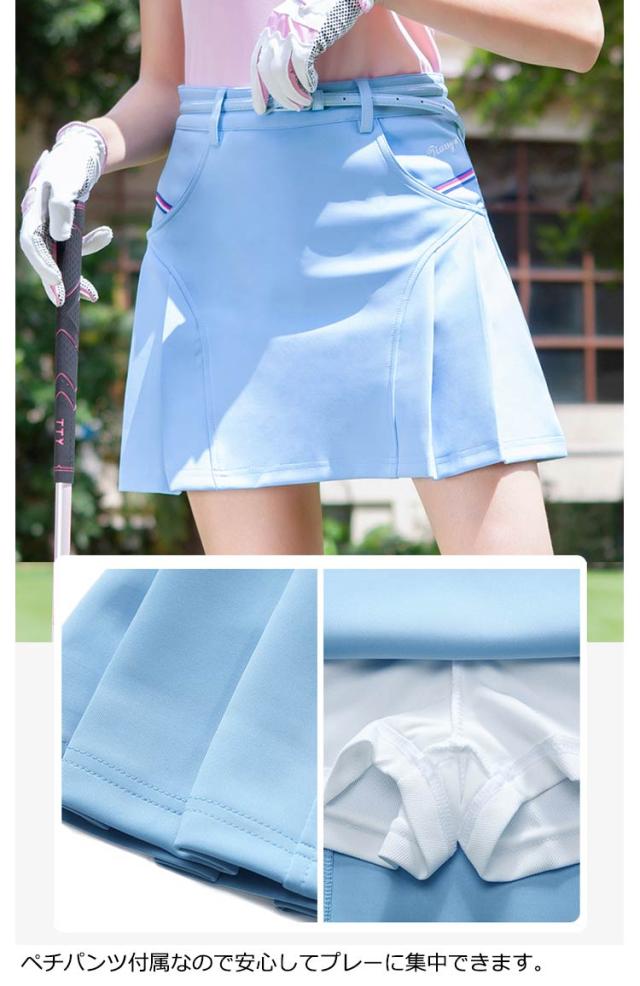 | クラシックで可愛いプリーツスデザインのゴルフスカート。 ショートパンツ付きで激しい運動や風の強い日のラウンドでもスカートの中がポロっと見えることも防止できます。 洗濯してもシワになりにくい、次回も初回と変わらない履き心地が楽しめます。 シンプルなデザインで普段着としてオールシーズン着回しが楽しめます。 ペチパンツ付属なので安心してプレーに集中できます。 ゴルフウェアはもちろん、カジュアルウェアやボウリング、テニス、バトミントン、スカッシュ等のスポーツにも最適。 | |