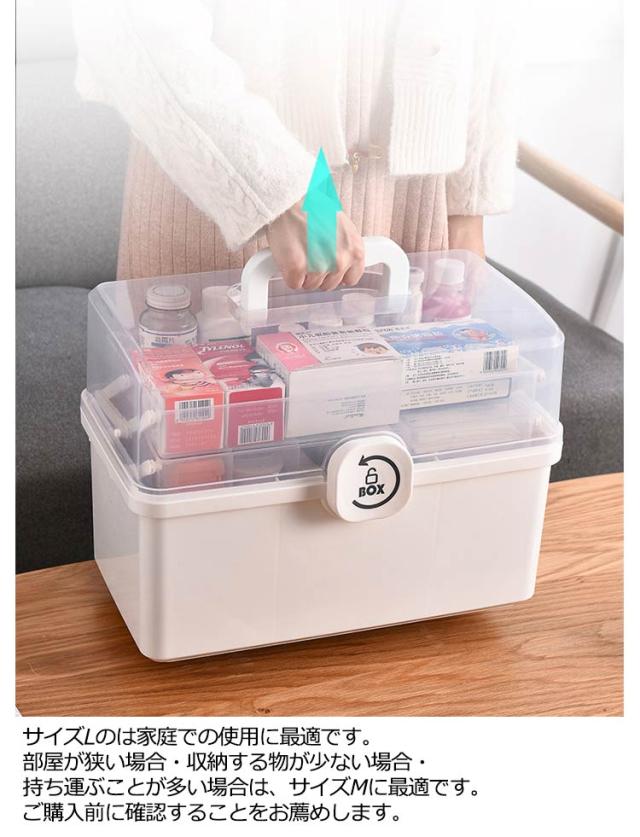 | 【大容量&コンパクトで収納便利】 【安心安全な造り】 【見やすく取り出しやすい】 【三段式家庭用薬箱は様々な需要にこたえます】 【多様な用途】 市販の薬収納ボックスや救急ボックス、工具箱よりはるかに大容量でおしゃれなた収納ケースです。 3段トレー付き工具箱のため沢山の物を綺麗に収納することが可能です。 コンパクトなため部屋のどこでも収納でき、持ち運びにも便利な大きさです。 開閉部分には「回転式安全ロック」を採用することでお子さんが不用意に開けて薬を飲みこんでしまうことを防ぎます。また、持ち上げる際にフタが開いて中身が全て落ちることを防ぎます。 フタは180度開閉タイプのため、どこに何をしまっているか一目で把握することができ緊急時でも直ぐに薬を取り出せます。 透明カバーのためフタを閉めた状態でも中身が一目瞭然です。 サイズLのは家庭での使用に最適です。部屋が狭い場合・収納する物が少ない場合・持ち運ぶことが多い場合は、サイズMに最適です。ご購入前に確認することをお薦めします。 薬箱以外にも、工具入れ、文具入れ、メイク道具入れ、おもちゃ箱、ソーイングボックス、ベイブレード ケース、釣具 収納、車載ボックス、ピットボックス、その他の様々な用途で活躍しています! | |
