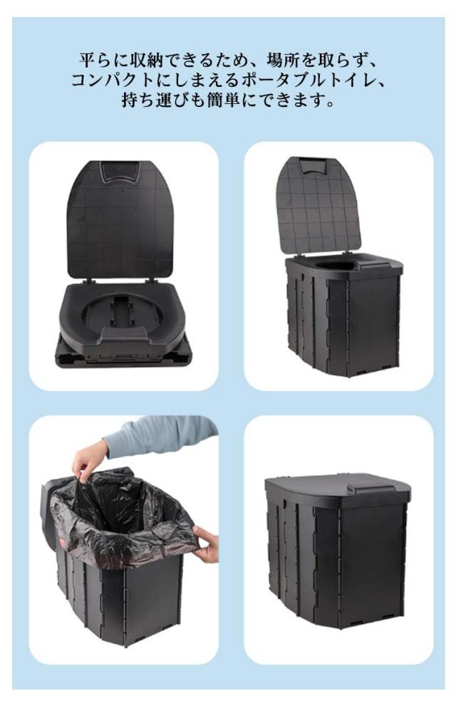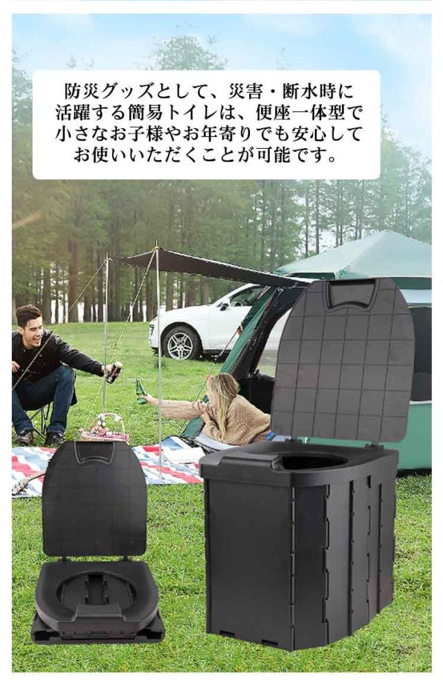 | コンパクトに持ち運び・収納できる折りたたみ式ポータブルトイレ。 防災グッズとして、災害・断水時に活躍する簡易トイレは、便座一体型で小さなお子様やお年寄りでも安心してお使いいただくことが可能です。 非常用としてはもちろん、介護用トイレ・屋外用トイレ・登山・釣り・キャンプ・渋滞時などの車用トイレなど幅広いシーンで活躍します。 平らに収納できるため、場所を取らず、コンパクトにしまえるポータブルトイレ、持ち運びも簡単にできます。 耐荷重は200kg、耐久性に優れた丈夫な設計で、誰でも気軽に使用できる簡易トイレです。 男女共に座りやすく安心のU型座面、防災グッズとして活躍する便利な簡易トイレは、避難所や自宅、テントの中など様々な場所に簡単に設置することができます。 水洗いOKなので、いつでも清潔な状態で使用できるポータブルトイレは、付属の排泄物用袋をセットすることで誰でも簡単に利用可能です。 フタつきなので、匂いや飛沫の飛散等を防げるため衛生的! 車載トイレとして旅行やキャンプなどのアウトドアにも使用でき、普段は、ごみ箱などとして使用できる簡易トイレです | |