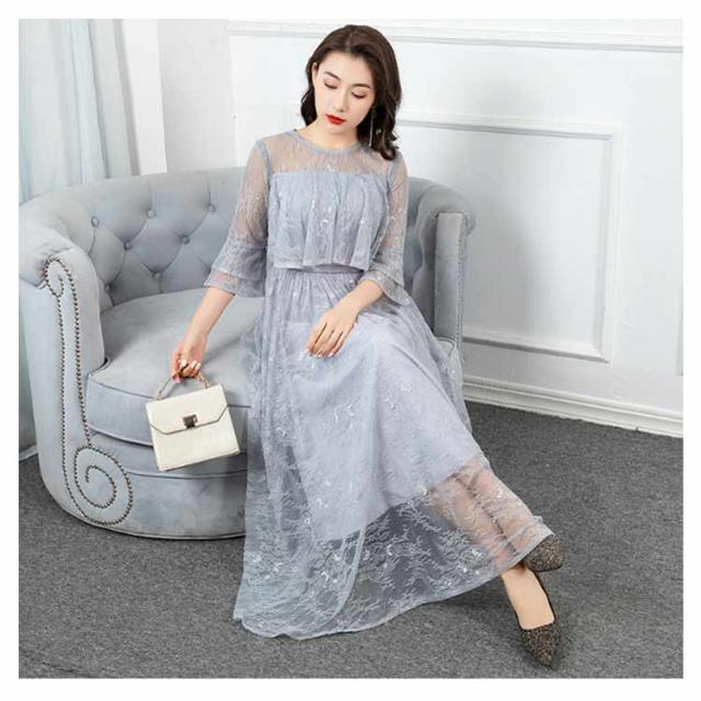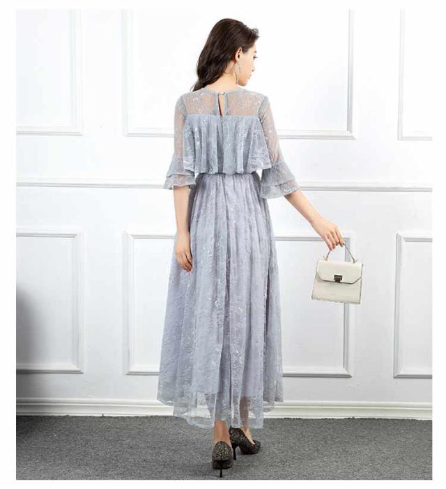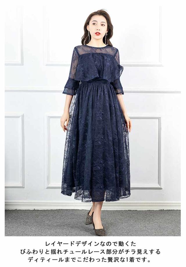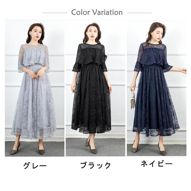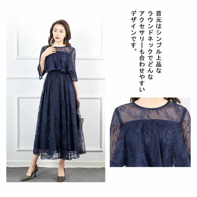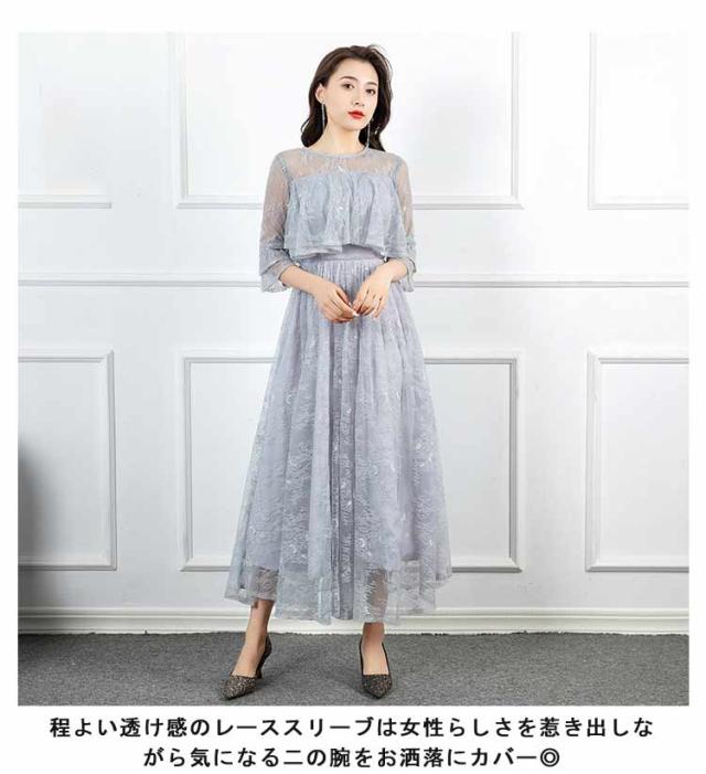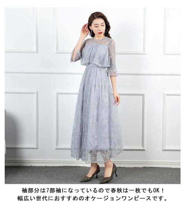 パーティードレス 結婚式 ワンピース フォーマルドレス ドレス レーススリーブ 7分袖 Aライン きれいめ 上品 マキシ丈 クルーネック バックファスナー 後ファスナー 体型カバー エレガント 二次会 披露宴 お呼ばれ 成人式 同窓会